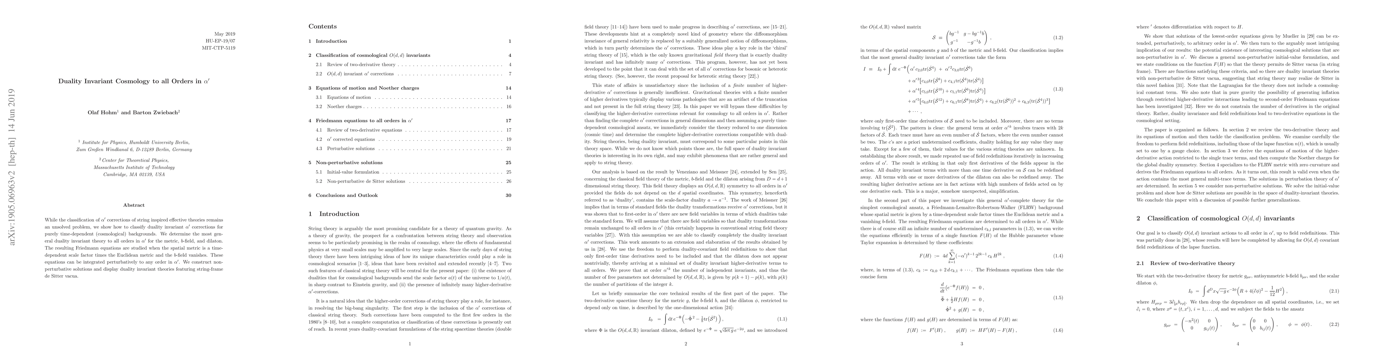 While the classification of $\alpha'$ corrections of string inspired effective theories remains an unsolved problem, we show how to classify duality invariant $\alpha'$ corrections for purely time-dependent (cosmological) backgrounds. We determine the most general duality invariant theory to all orders in $\alpha'$ for the metric, $b$-field, and dilaton. The resulting Friedmann equations are studied when the spatial metric is a time-dependent scale factor times the Euclidean metric and the $b$-field vanishes. These equations can be integrated perturbatively to any order in $\alpha'$. We construct non-perturbative solutions and display duality invariant theories featuring string-frame de Sitter vacua.