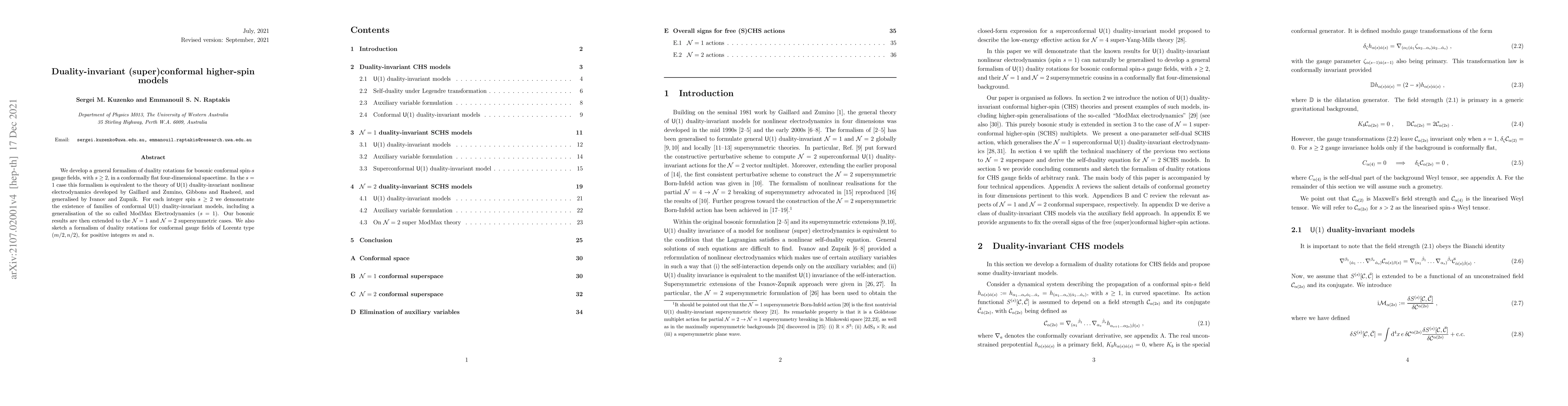 We develop a general formalism of duality rotations for bosonic conformal spin-$s$ gauge fields, with $s\geq 2$, in a conformally flat four-dimensional spacetime. In the $s=1$ case this formalism is equivalent to the theory of $\mathsf{U}(1)$ duality-invariant nonlinear electrodynamics developed by Gaillard and Zumino, Gibbons and Rasheed, and generalised by Ivanov and Zupnik. For each integer spin $s\geq 2$ we demonstrate the existence of families of conformal $\mathsf{U}(1)$ duality-invariant models, including a generalisation of the so called ModMax Electrodynamics ($s=1$). Our bosonic results are then extended to the $\mathcal{N}=1$ and $\mathcal{N}=2$ supersymmetric cases. We also sketch a formalism of duality rotations for conformal gauge fields of Lorentz type $(m/2, n/2)$, for positive integers $m $ and $n$.