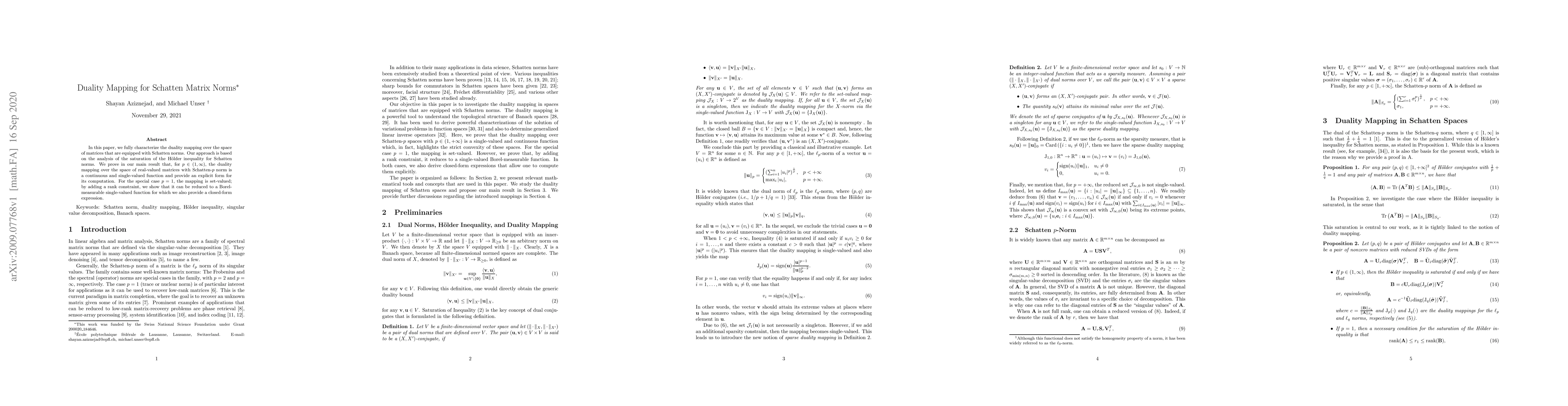 This paper characterizes the duality mapping for Schatten matrix norms, demonstrating continuity and providing an explicit form for $p \in (1,\infty)$. For $p=1$, it shows the mapping is set-valued but becomes Borel-measurable and single-valued under a rank constraint, with a closed-form expression provided.