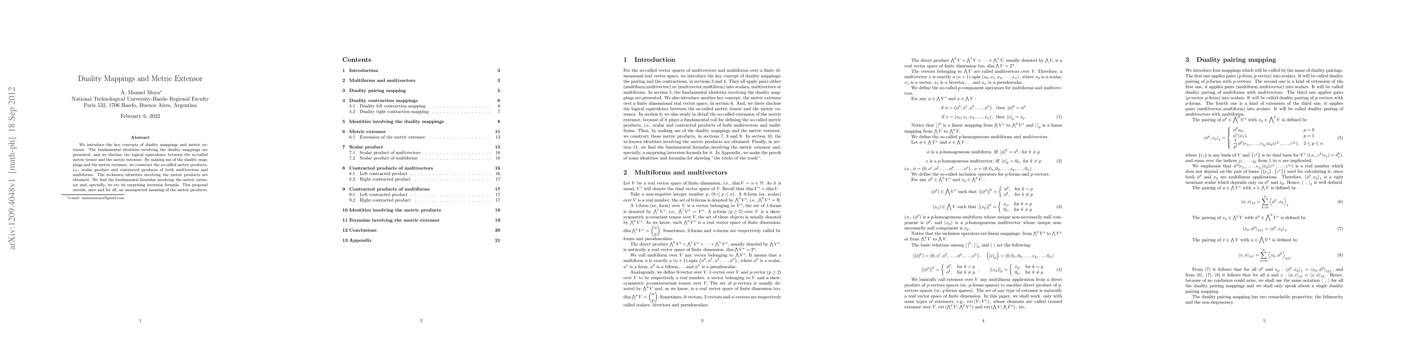 We introduce the key concepts of duality mappings and metric extensor. The fundamental identities involving the duality mappings are presented, and we disclose the logical equivalence between the so-called metric tensor and the metric extensor. By making use of the duality mappings and the metric extensor, we construct the so-called metric products, i.e., scalar product and contracted products of both multivectors and multiforms. The so-known identities involving the metric products are obtained. We find the fundamental formulas involving the metric extensor and, specially, we try its surprising inversion formula. This proposal unveils, once and for all, an unsuspected meaning of the metric products.