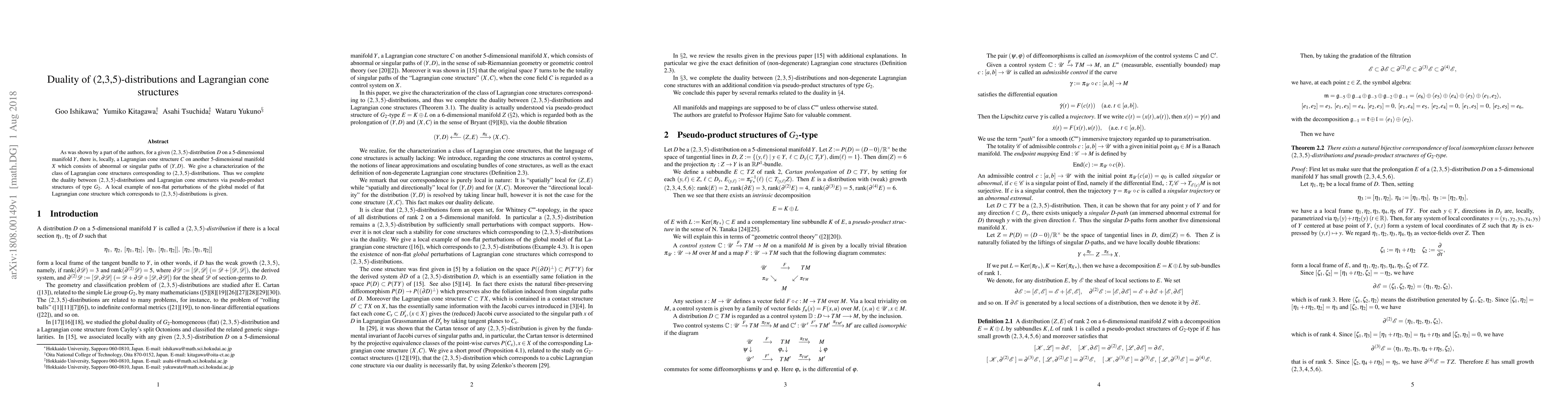 This paper characterizes the duality between $(2, 3, 5)$-distributions on $5$-dimensional manifolds and Lagrangian cone structures, establishing a correspondence via $G_2$ pseudo-product structures. It provides an example of non-flat perturbations of a global flat Lagrangian cone structure related to these distributions.