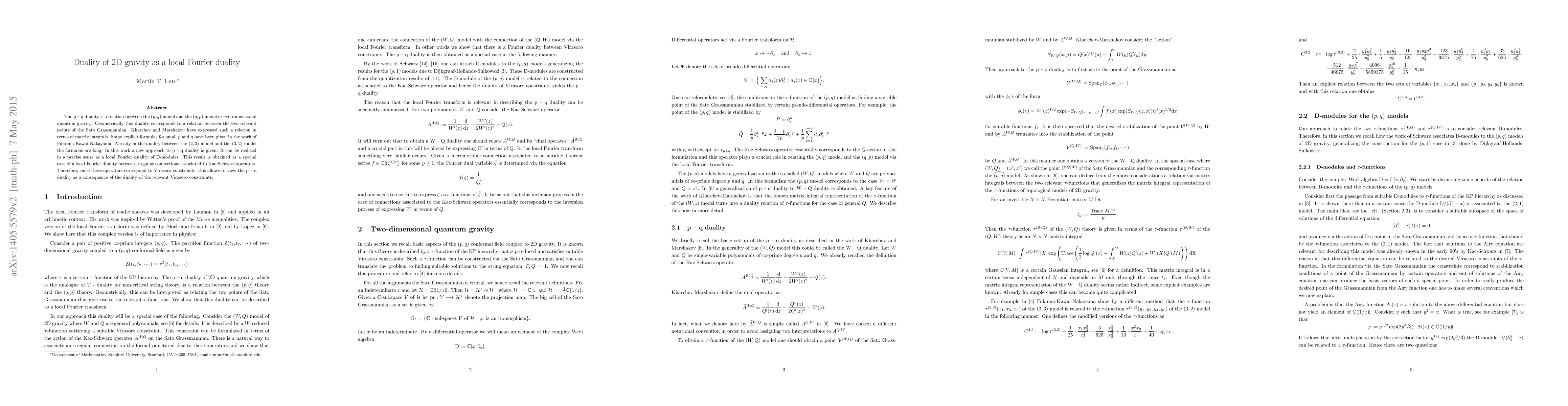 This paper presents a novel approach to the p-q duality in two-dimensional quantum gravity, framing it as a local Fourier duality of D-modules. This perspective reveals the duality as a consequence of the duality of the relevant Virasoro constraints, derived from the local Fourier duality between irregular connections associated with Kac-Schwarz operators.