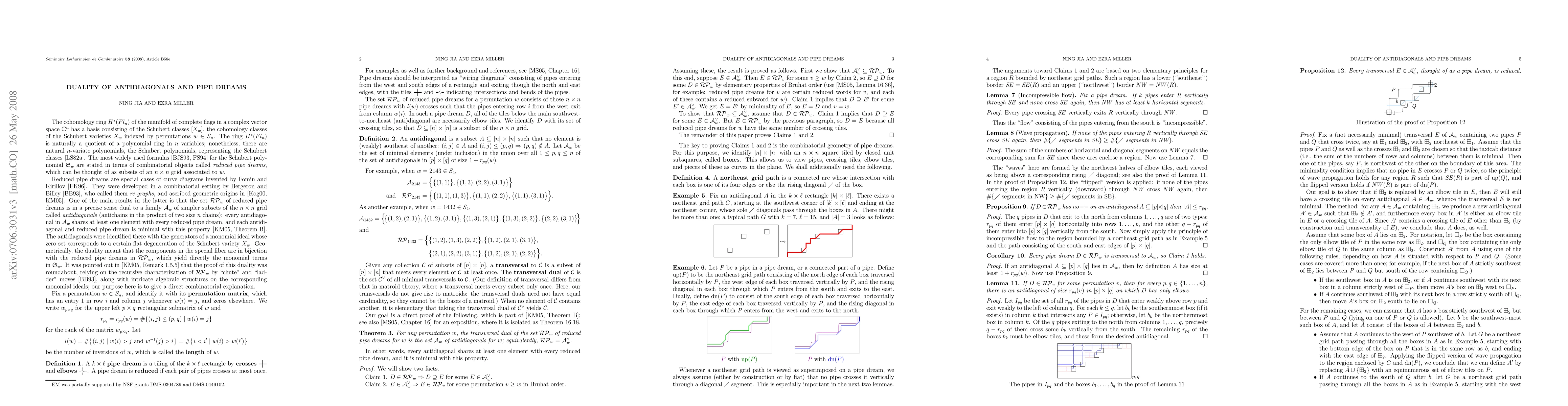 This paper offers a direct combinatorial proof of the duality between reduced pipe dreams and antidiagonals, which leads to a combinatorial expression for Schubert polynomials, improving upon the original complex algebraic proof.