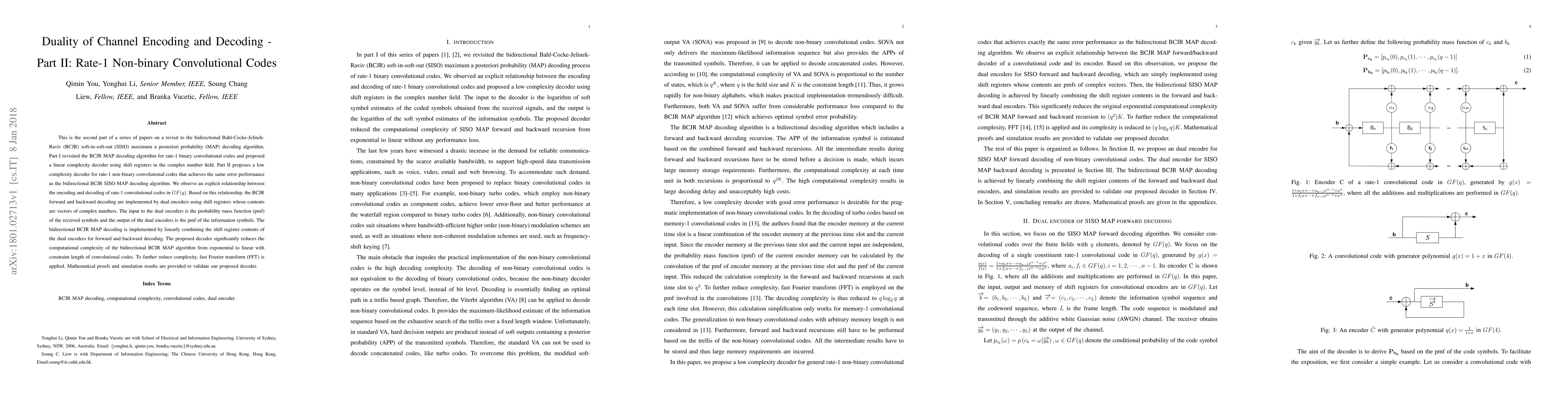 This paper proposes a low complexity decoder for rate-1 non-binary convolutional codes leveraging dual encoders based on shift registers in the complex number field, achieving the same error performance as the bidirectional BCJR MAP decoding algorithm while reducing computational complexity from exponential to linear. Fast Fourier Transform (FFT) is applied to further decrease complexity, validated by mathematical proofs and simulation results.