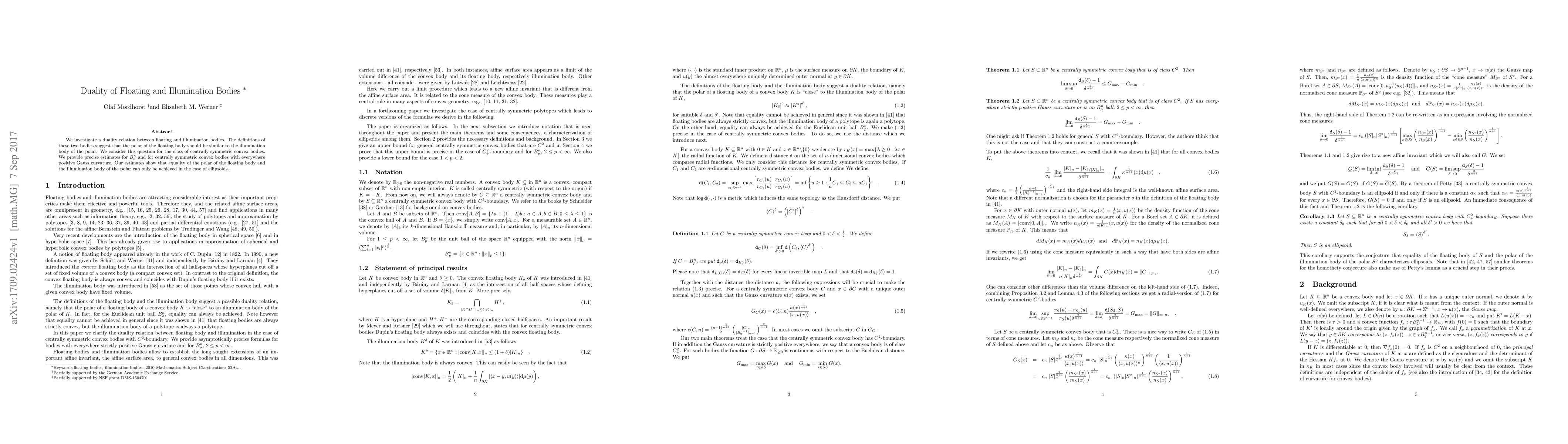 This paper explores the duality between floating bodies and illumination bodies among centrally symmetric convex bodies, showing that equality of their polars can only occur for ellipsoids, with precise estimates provided for $(B_p^n)$ and bodies with positive Gauss curvature.