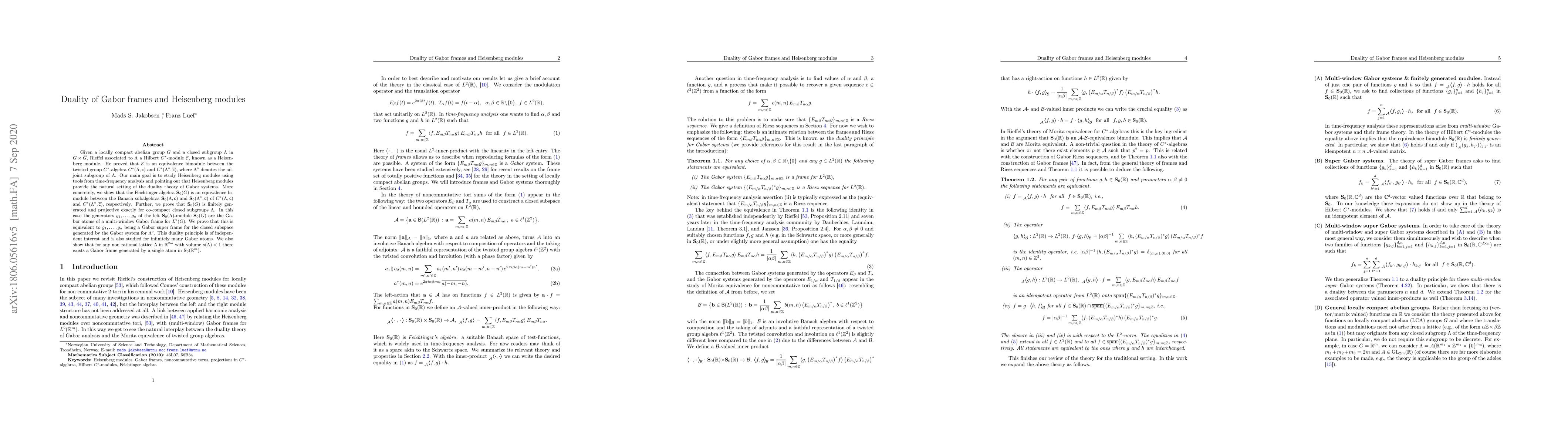 Given a locally compact abelian group $G$ and a closed subgroup $\Lambda$ in $G\times\widehat{G}$, Rieffel associated to $\Lambda$ a Hilbert $C^*$-module $\mathcal{E}$, known as a Heisenberg module. He proved that $\mathcal{E}$ is an equivalence bimodule between the twisted group $C^*$-algebra $C^*(\Lambda,\textsf{c})$ and $C^*(\Lambda^\circ,\bar{\textsf{c}})$, where $\Lambda^{\circ}$ denotes the adjoint subgroup of $\Lambda$. Our main goal is to study Heisenberg modules using tools from time-frequency analysis and pointing out that Heisenberg modules provide the natural setting of the duality theory of Gabor systems. More concretely, we show that the Feichtinger algebra ${\textbf{S}}_{0}(G)$ is an equivalence bimodule between the Banach subalgebras ${\textbf{S}}_{0}(\Lambda,\textsf{c})$ and ${\textbf{S}}_{0}(\Lambda^{\circ},\bar{\textsf{c}})$ of $C^*(\Lambda,\textsf{c})$ and $C^*(\Lambda^\circ,\bar{\textsf{c}})$, respectively. Further, we prove that ${\textbf{S}}_{0}(G)$ is finitely generated and projective exactly for co-compact closed subgroups $\Lambda$. In this case the generators $g_1,\ldots,g_n$ of the left ${\textbf{S}}_{0}(\Lambda)$-module ${\textbf{S}}_{0}(G)$ are the Gabor atoms of a multi-window Gabor frame for $L^2(G)$. We prove that this is equivalent to $g_1,\ldots,g_n$ being a Gabor super frame for the closed subspace generated by the Gabor system for $\Lambda^{\circ}$. This duality principle is of independent interest and is also studied for infinitely many Gabor atoms. We also show that for any non-rational lattice $\Lambda$ in $\mathbb{R}^{2m}$ with volume ${s}(\Lambda)<1$ there exists a Gabor frame generated by a single atom in ${\textbf{S}}_{0}(\mathbb{R}^m)$.