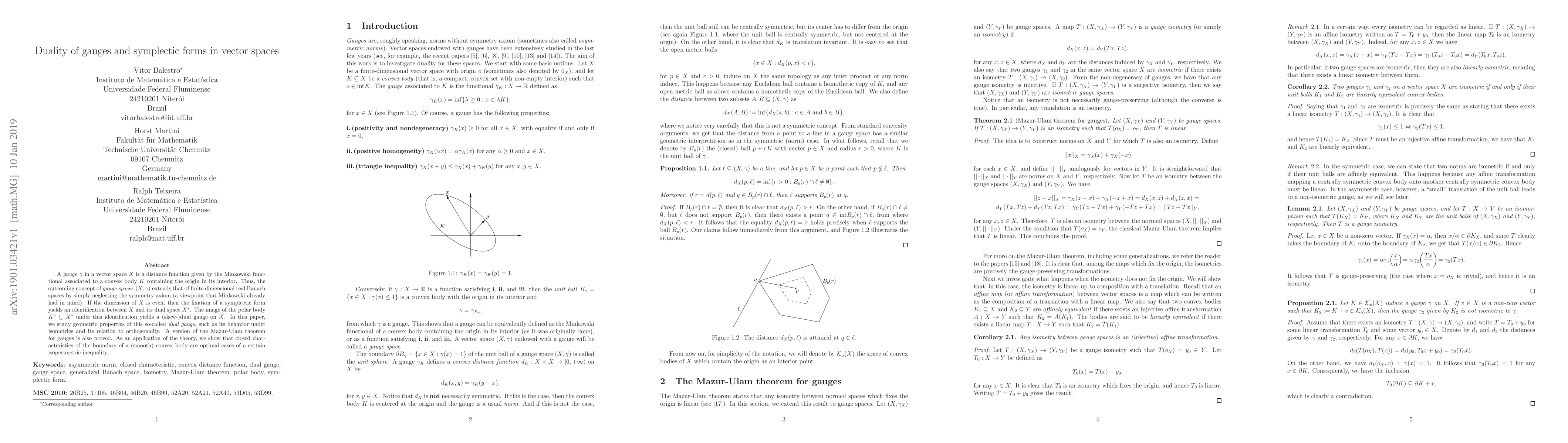 A gauge $\gamma$ in a vector space $X$ is a distance function given by the Minkowski functional associated to a convex body $K$ containing the origin in its interior. Thus, the outcoming concept of gauge spaces $(X, \gamma)$ extends that of finite dimensional real Banach spaces by simply neglecting the symmetry axiom (a viewpoint that Minkowski already had in mind). If the dimension of $X$ is even, then the fixation of a symplectic form yields an identification between $X$ and its dual space $X^*$ . The image of the polar body $K^{\circ}\subseteq X^*$ under this identification yields a (skew-)dual gauge on $X$. In this paper, we study geometric properties of this so-called dual gauge, such as its behavior under isometries and its relation to orthogonality. A version of the Mazur-Ulam theorem for gauges is also proved. As an application of the theory, we show that closed characteristics of the boundary of a (smooth) convex body are optimal cases of a certain isoperimetric inequality.