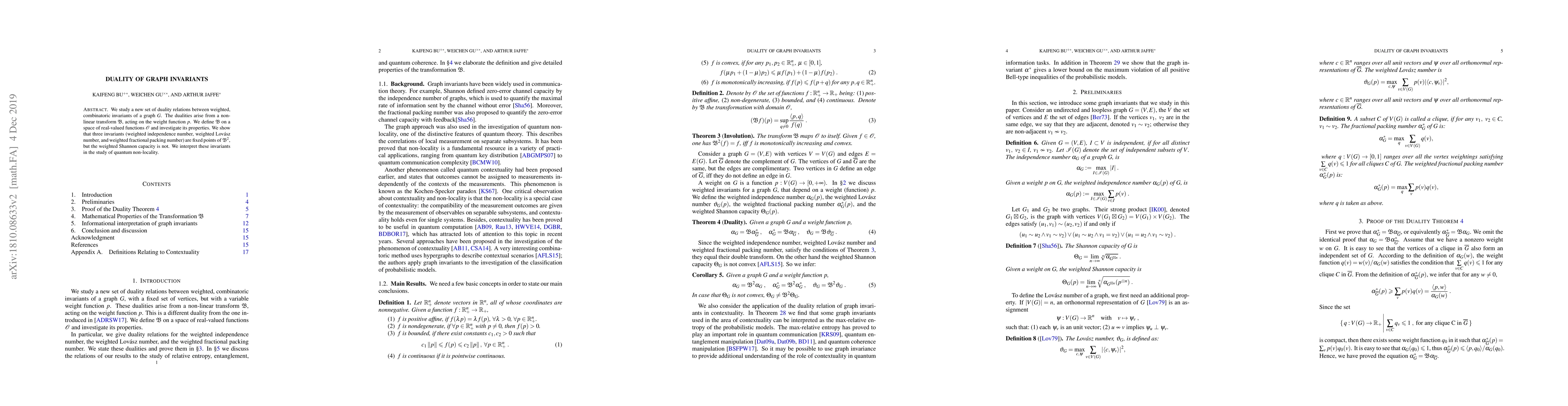We study a new set of duality relations between weighted, combinatoric invariants of a graph $G$. The dualities arise from a non-linear transform $\mathfrak{B}$, acting on the weight function $p$. We define $\mathfrak{B}$ on a space of real-valued functions $\mathcal{O}$ and investigate its properties. We show that three invariants (weighted independence number, weighted Lov\'{a}sz number, and weighted fractional packing number) are fixed points of $\mathfrak{B}^{2}$, but the weighted Shannon capacity is not. We interpret these invariants in the study of quantum non-locality.
