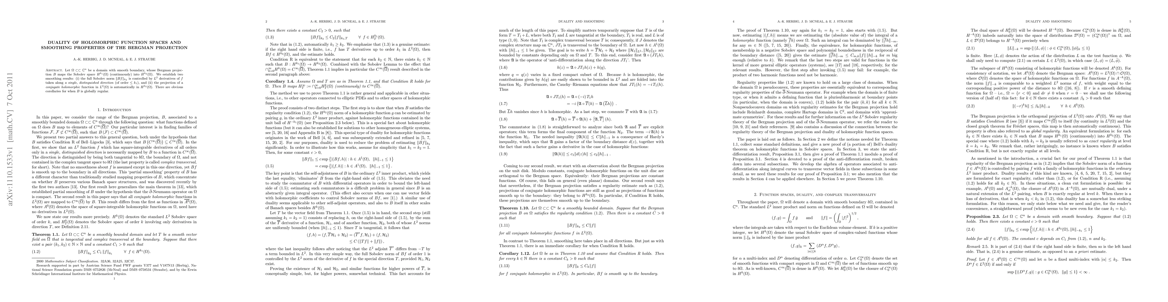 Summary: This paper investigates the smoothing properties of the Bergman projection for holomorphic functions in bounded domains with smooth boundaries. It establishes two key results: (i) the Bergman projection controls the full Sobolev norm using $L^2$ derivatives along a distinguished direction, and (ii) the projection of a conjugate holomorphic function in $L^2$ is automatically in the Sobolev space $H^{k_{2}}$.