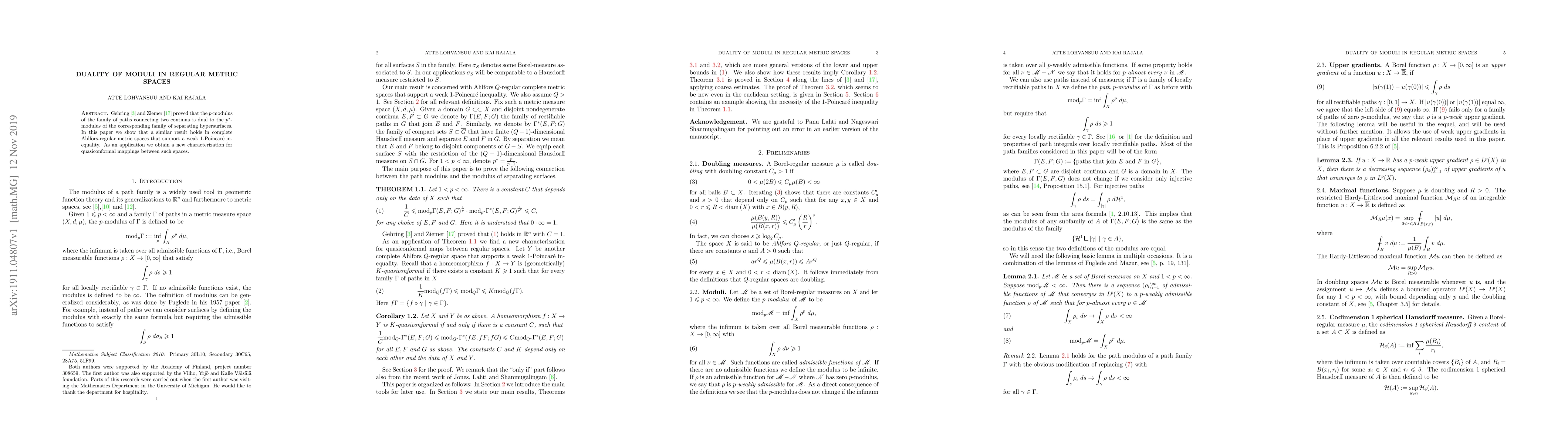 This paper extends the duality of moduli between path families and separating hypersurfaces, originally proven in Euclidean spaces, to complete Ahlfors-regular metric spaces with a weak 1-Poincaré inequality, and provides a new characterization for quasiconformal mappings in these spaces.