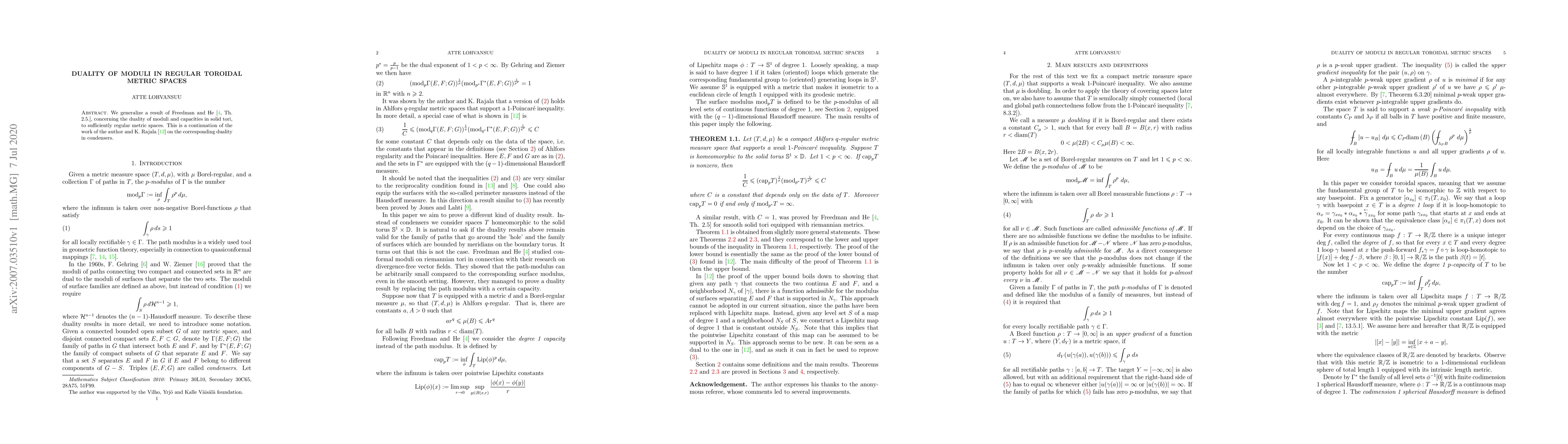 This paper extends the duality between moduli and capacities from solid tori to regular toroidal metric spaces, building on prior work by the author and K. Rajala on condensers. The focus is on sufficiently regular metric spaces to ensure the applicability of the duality results.