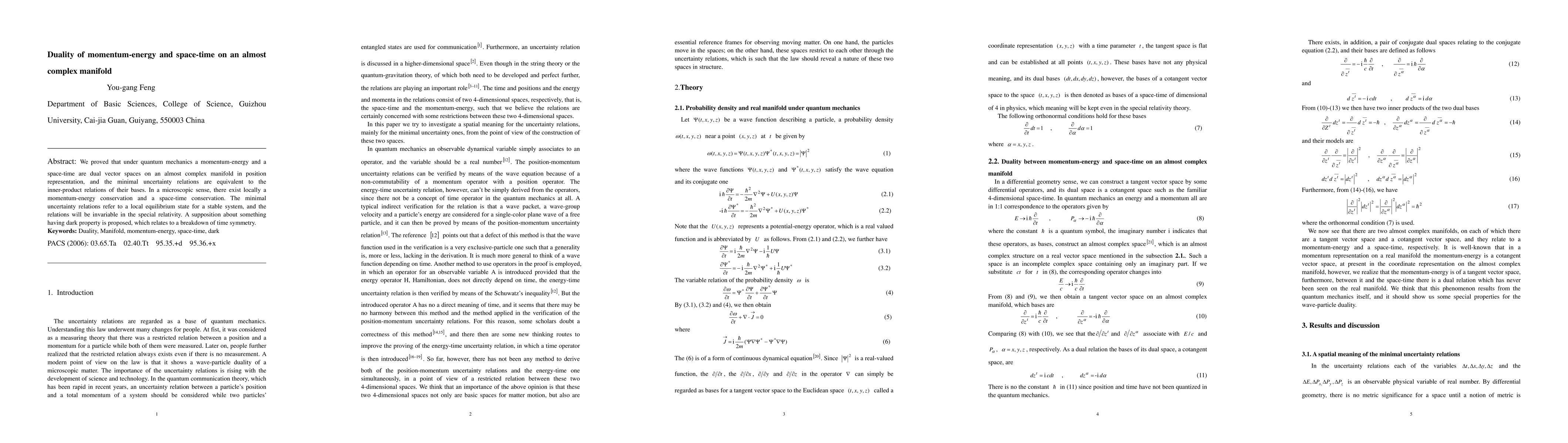 We proved that under quantum mechanics a momentum-energy and a space-time are dual vector spaces on an almost complex manifold in position representation, and the minimal uncertainty relations are equivalent to the inner-product relations of their bases. In a microscopic sense, there exist locally a momentum-energy conservation and a space-time conservation. The minimal uncertainty relations refer to a local equilibrium state for a stable system, and the relations will be invariable in the special relativity. A supposition about something having dark property is proposed, which relates to a breakdown of time symmetry.