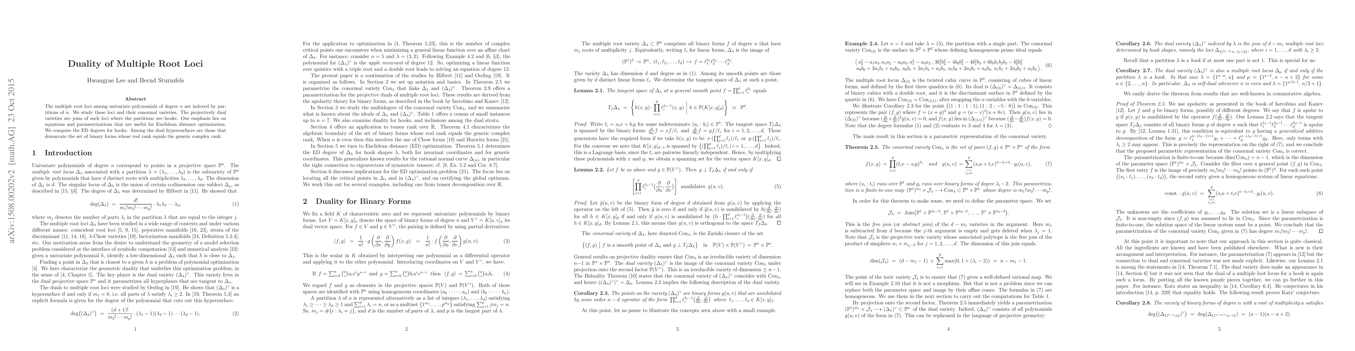 The multiple root loci among univariate polynomials of degree $n$ are indexed by partitions of $n$. We study these loci and their conormal varieties. The projectively dual varieties are joins of such loci where the partitions are hooks. Our emphasis lies on equations and parametrizations that are useful for Euclidean distance optimization. We compute the ED degrees for hooks. Among the dual hypersurfaces are those that demarcate the set of binary forms whose real rank equals the generic complex rank.
