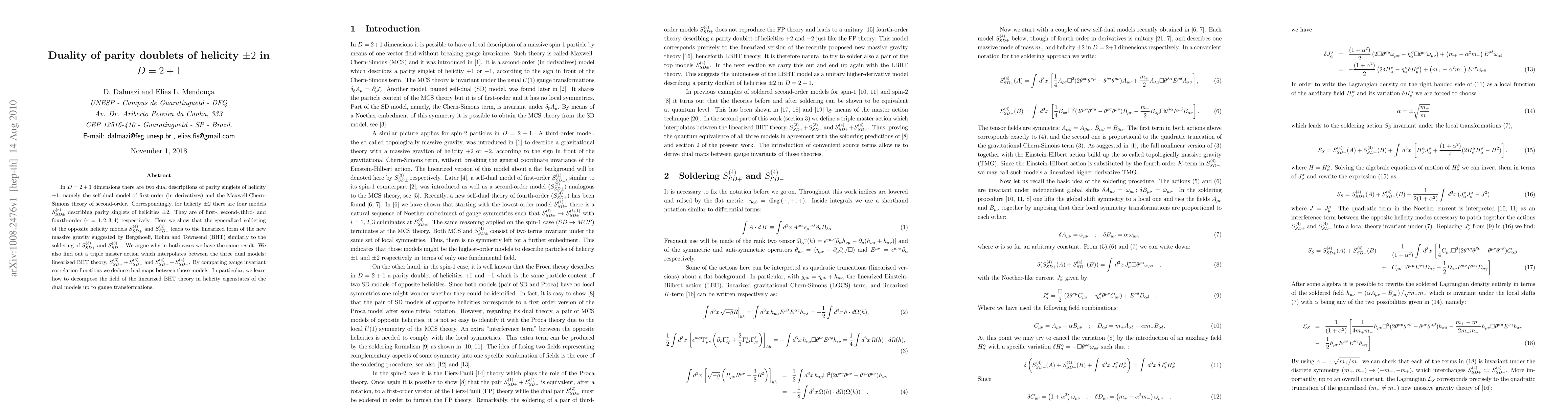 In $D=2+1$ dimensions there are two dual descriptions of parity singlets of helicity $\pm 1$, namely the self-dual model of first-order (in derivatives) and the Maxwell-Chern-Simons theory of second-order. Correspondingly, for helicity $\pm 2$ there are four models $S_{SD\pm}^{(r)}$ describing parity singlets of helicities $\pm 2$. They are of first-, second-,third- and fourth-order ($r=1,2,3,4$) respectively. Here we show that the generalized soldering of the opposite helicity models $S_{SD+}^{(4)}$ and $S_{SD-}^{(4)}$ leads to the linearized form of the new massive gravity suggested by Bergshoeff, Hohm and Townsend (BHT) similarly to the soldering of $S_{SD+}^{(3)}$ and $S_{SD-}^{(3)}$. We argue why in both cases we have the same result. We also find out a triple master action which interpolates between the three dual models: linearized BHT theory, $S_{SD+}^{(3)} + S_{SD-}^{(3)}$ and $S_{SD+}^{(4)} + S_{SD-}^{(4)}$. By comparing gauge invariant correlation functions we deduce dual maps between those models. In particular, we learn how to decompose the field of the linearized BHT theory in helicity eigenstates of the dual models up to gauge transformations.