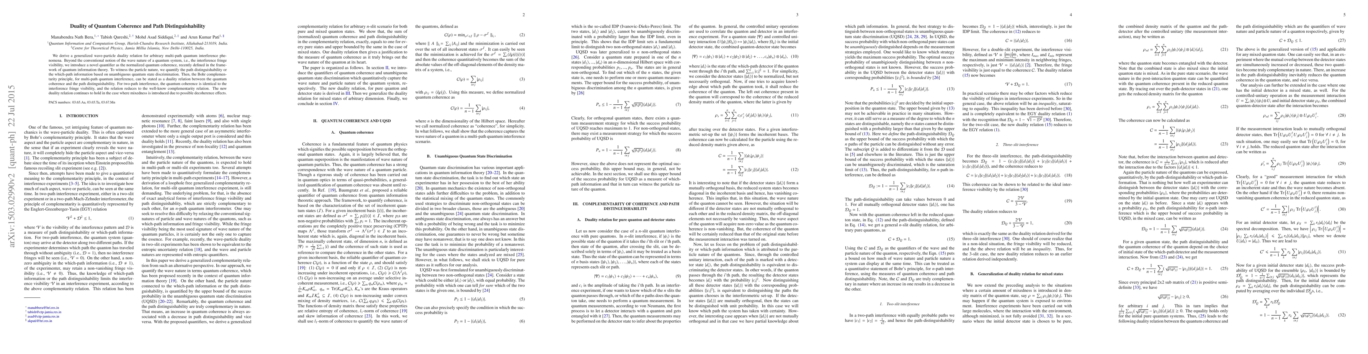 The research derives a generalized wave-particle duality relation for arbitrary multipath quantum interference phenomena, introducing normalized quantum coherence as a quantifier of wave nature and path distinguishability as a quantifier of particle nature, based on unambiguous quantum state discrimination.