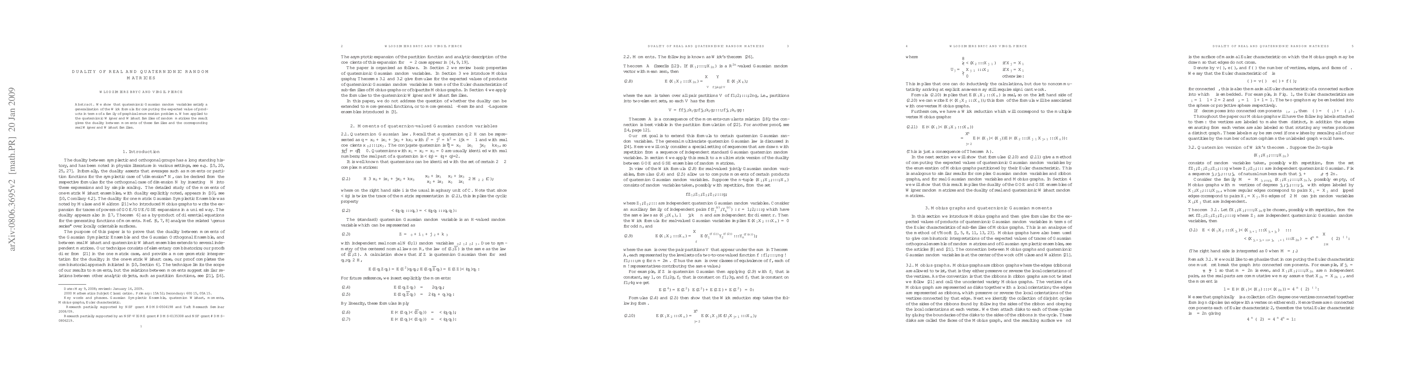 We show that quaternionic Gaussian random variables satisfy a generalization of the Wick formula for computing the expected value of products in terms of a family of graphical enumeration problems. When applied to the quaternionic Wigner and Wishart families of random matrices the result gives the duality between moments of these families and the corresponding real Wigner and Wishart families.