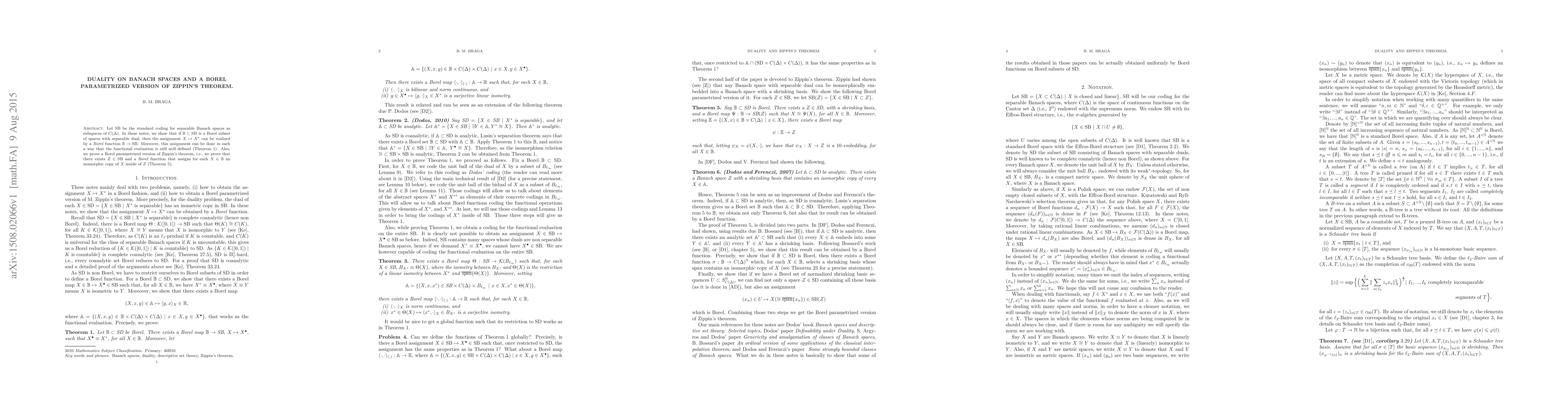 Let SB be the standard coding for separable Banach spaces as subspaces of $C(\Delta)$. In these notes, we show that if $\mathbb{B} \subset \text{SB}$ is a Borel subset of spaces with separable dual, then the assignment $X \mapsto X^*$ can be realized by a Borel function $\mathbb{B}\to \text{SB}$. Moreover, this assignment can be done in such a way that the functional evaluation is still well defined (Theorem $1$). Also, we prove a Borel parametrized version of Zippin's theorem, i.e., we prove that there exists $Z \in \text{SB}$ and a Borel function that assigns for each $X \in \mathbb{B}$ an isomorphic copy of $X$ inside of $Z$ (Theorem $5$).
