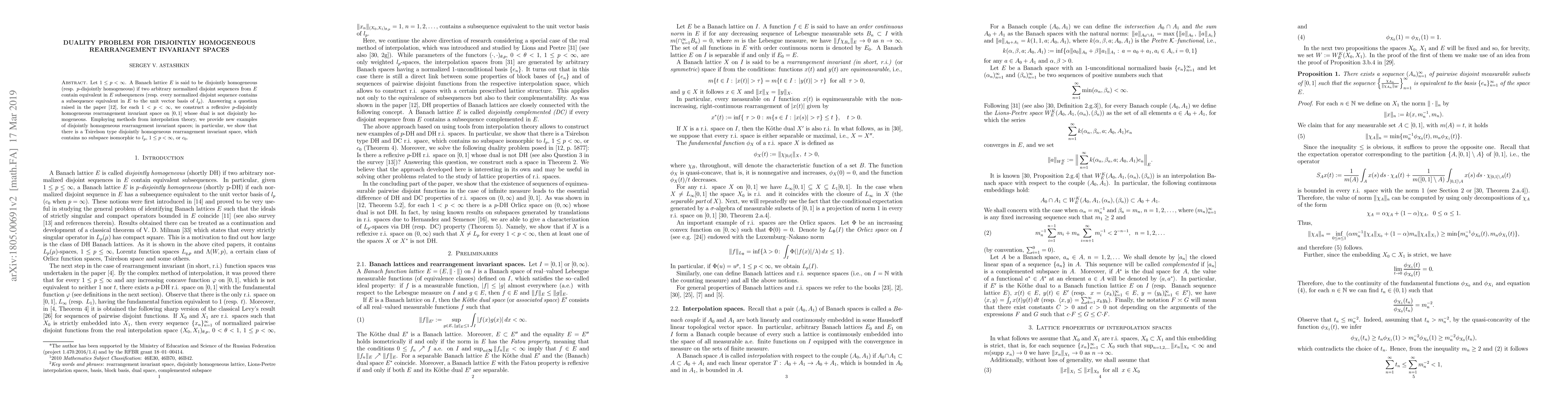 This paper constructs a reflexive $p$-disjointly homogeneous rearrangement invariant space on $[0,1]$ for $1<p<\infty$ whose dual is not disjointly homogeneous, addressing a question from 2014. It also provides new examples of disjointly homogeneous spaces, including a Tsirelson type space that does not contain subspaces isomorphic to $l_p$ or $c_0$.