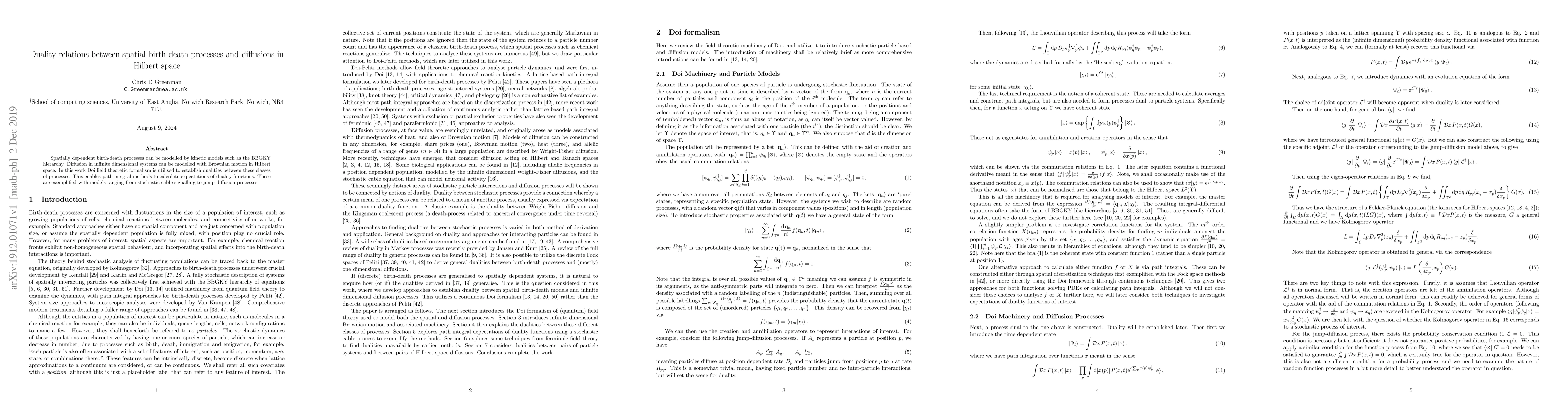 This paper establishes dualities between spatially dependent birth-death processes and diffusions in Hilbert space using Doi's field theoretic formalism, enabling path integral methods for calculating expectations. Applications include stochastic cable signalling and jump-diffusion processes.