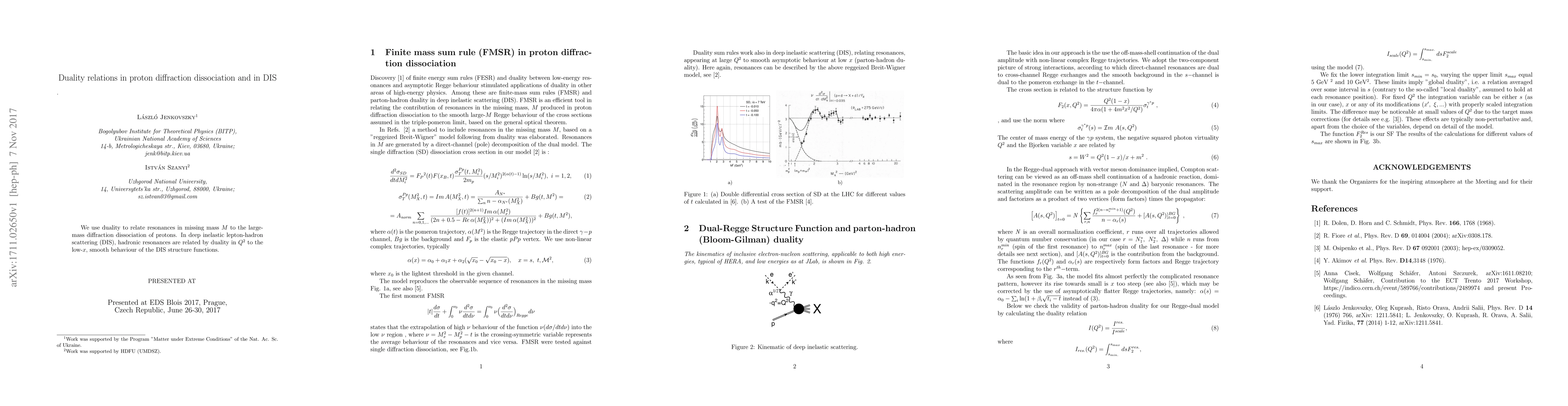 This paper uses duality to relate proton diffraction dissociation to deep inelastic scattering, finding a connection between resonances in missing mass and the behavior of structure functions in DIS.