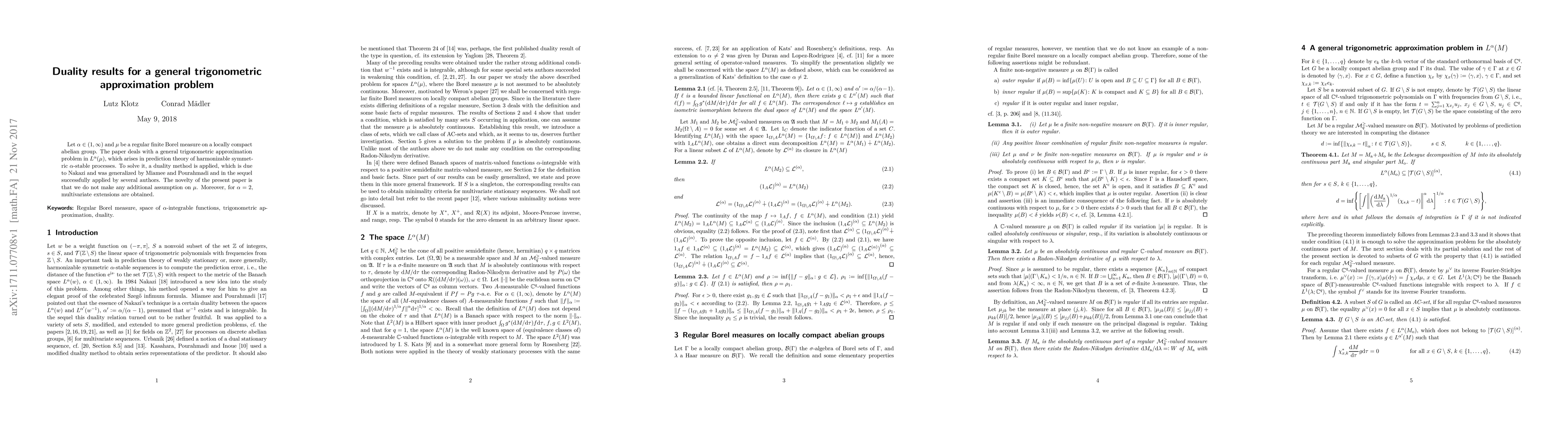 This paper solves a general trigonometric approximation problem in $L^ heta( u)$ using duality methods without additional assumptions on the measure $ u$, with applications to prediction theory of harmonizable symmetric processes, especially for $ heta=2$.