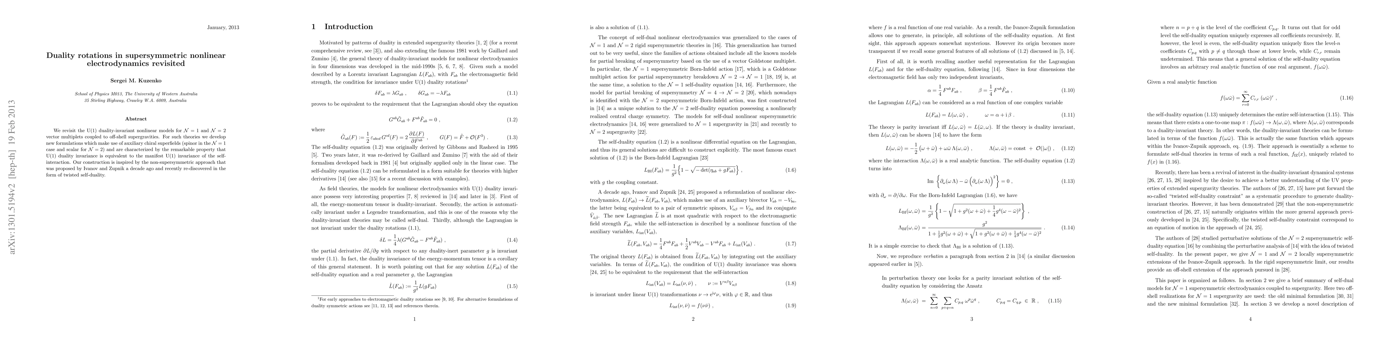 We revisit the U(1) duality-invariant nonlinear models for N=1 and N=2 vector multiplets coupled to off-shell supergravities. For such theories we develop new formulations which make use of auxiliary chiral superfields (spinor in the N=1 case and scalar for N=2) and are characterized by the remarkable property that U(1) duality invariance is equivalent to the manifest U(1) invariance of the self-interaction. Our construction is inspired by the non-supersymmetric approach that was proposed by Ivanov and Zupnik a decade ago and recently re-discovered in the form of twisted self-duality.