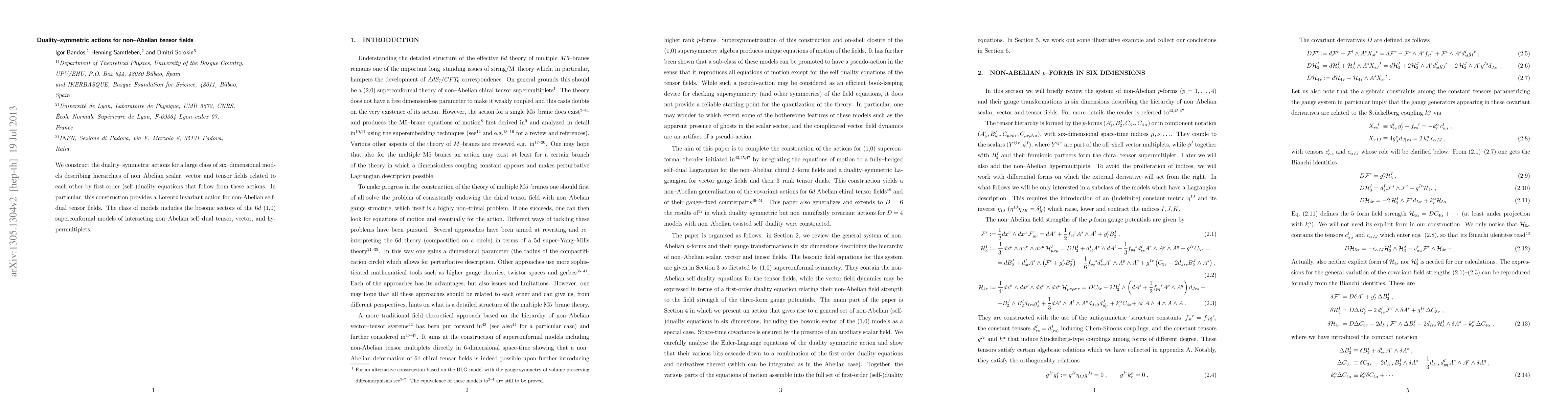 This paper constructs duality-symmetric actions for six-dimensional models encompassing non-Abelian scalar, vector, and tensor fields, demonstrating first-order self-duality relationships inherent in these actions. The study provides a Lorentz invariant action for non-Abelian self-dual tensor fields, including the bosonic sectors of 6d (1,0) superconformal models.