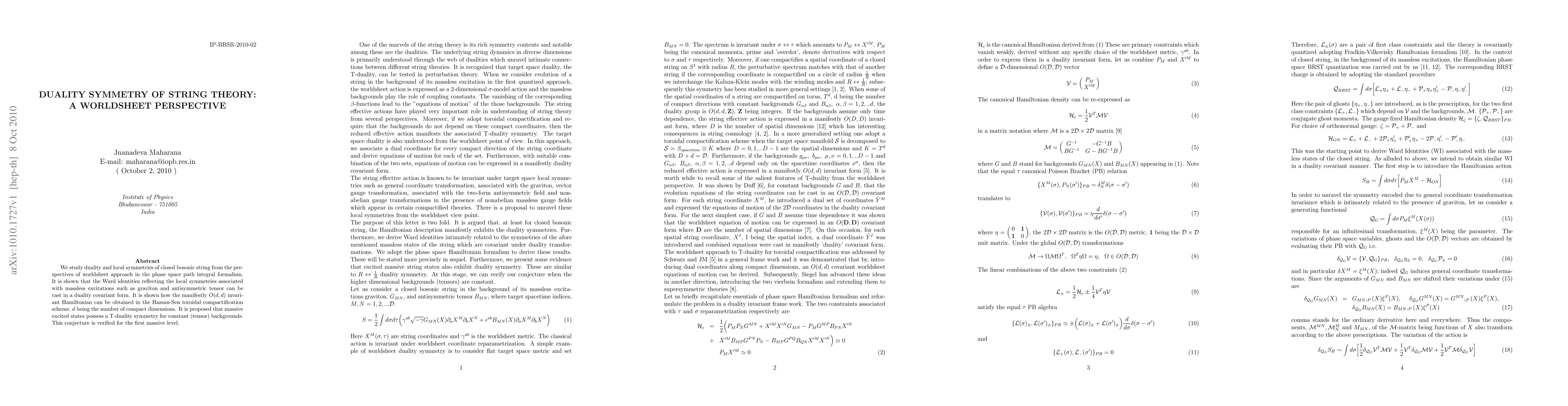 This paper explores the duality symmetries of closed bosonic string theory via a worldsheet approach, demonstrating how Ward identities can be cast in a duality covariant form and deriving an O(d,d) invariant Hamiltonian in the Hassan-Sen toroidal compactification scheme. It also proposes and verifies a T-duality symmetry for massive excited states under constant backgrounds for the first massive level.