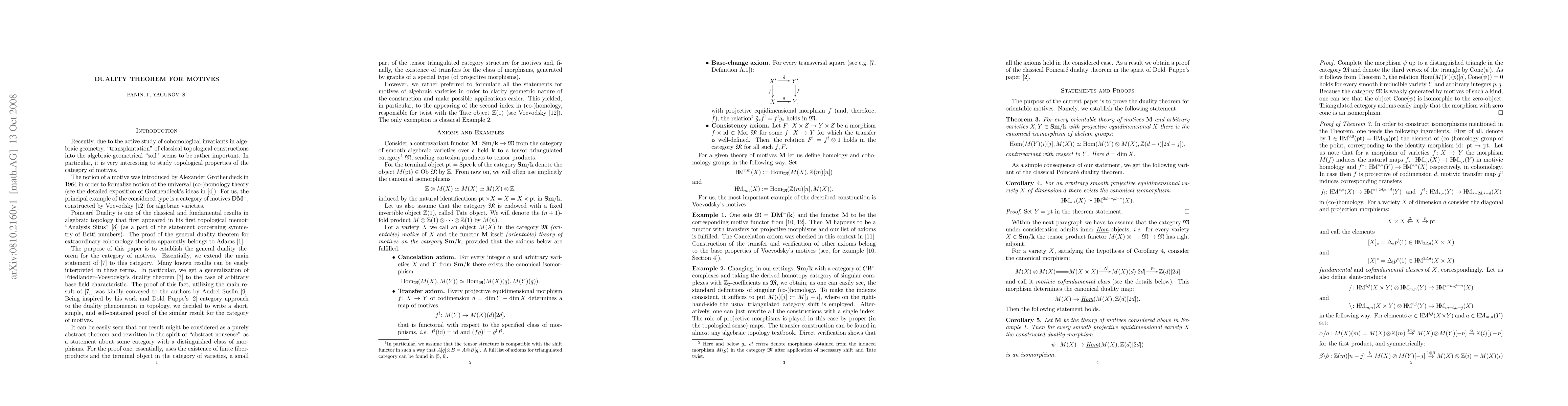 Researchers prove a general duality theorem for motives using Dold-Puppe category approach, with implications including a generalized version of Friedlander-Voevodsky's duality for arbitrary base field characteristic.
