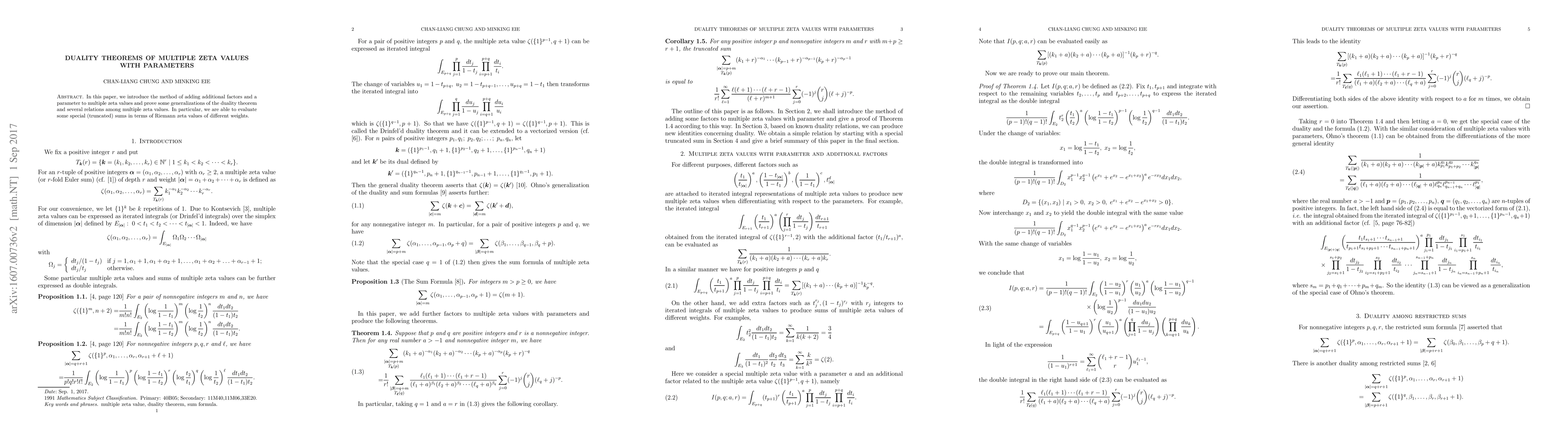 This paper presents a method for generalizing duality theorems involving multiple zeta values by incorporating additional factors and parameters, leading to evaluations of special sums in terms of Riemann zeta values with varying weights. The research establishes several new relations among multiple zeta values.