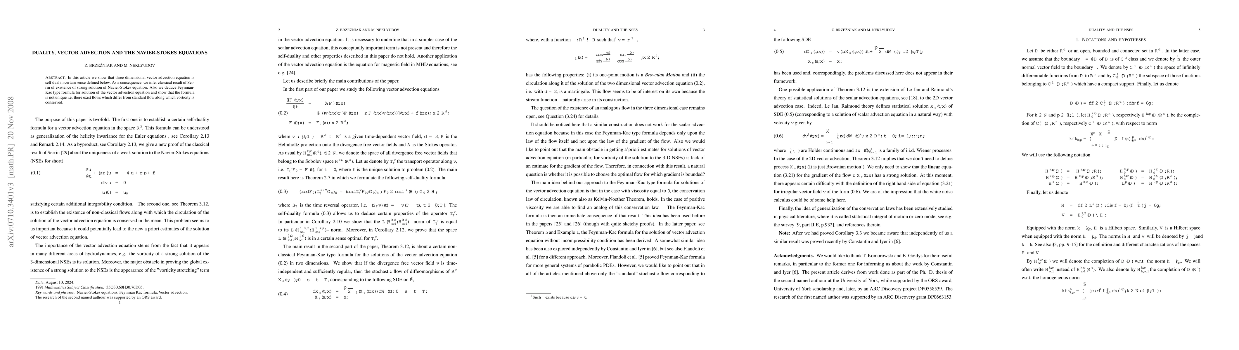 This paper demonstrates the self-duality of the three-dimensional vector advection equation, leading to a reproof of Serrin's theorem on the existence of strong solutions for the Navier-Stokes equations. It also presents a non-unique Feynman-Kac formula for the vector advection equation, revealing flows where vorticity conservation deviates from the standard path.