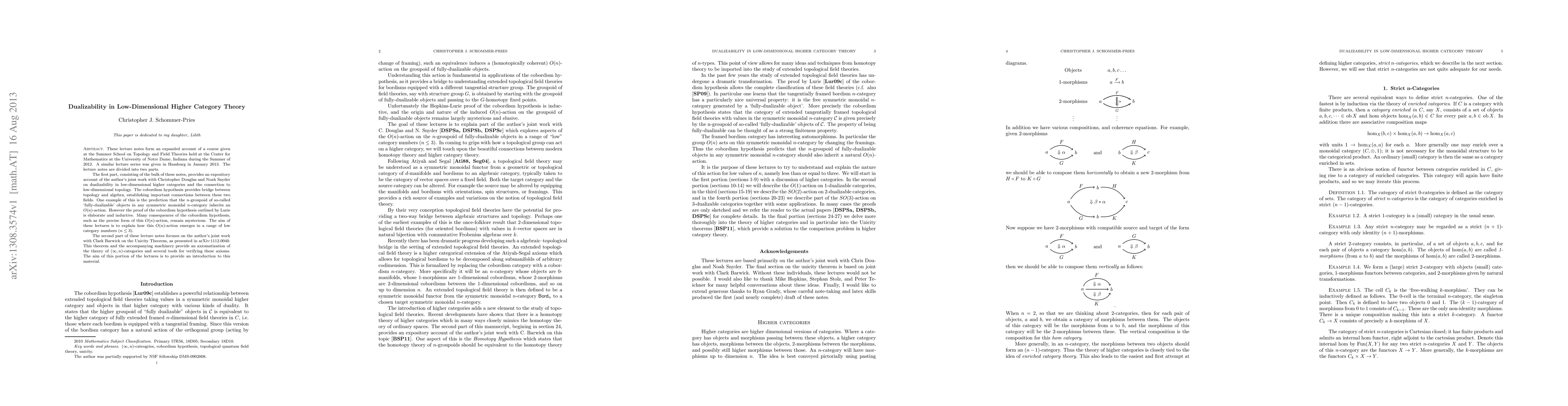This paper summarizes lectures on dualizability in low-dimensional higher category theory, focusing on the cobordism hypothesis's connections to low-dimensional topology and the O(n)-action in fully dualizable objects. It also introduces the Unicity Theorem for axiomatizing $(\infty,n)$-categories.
