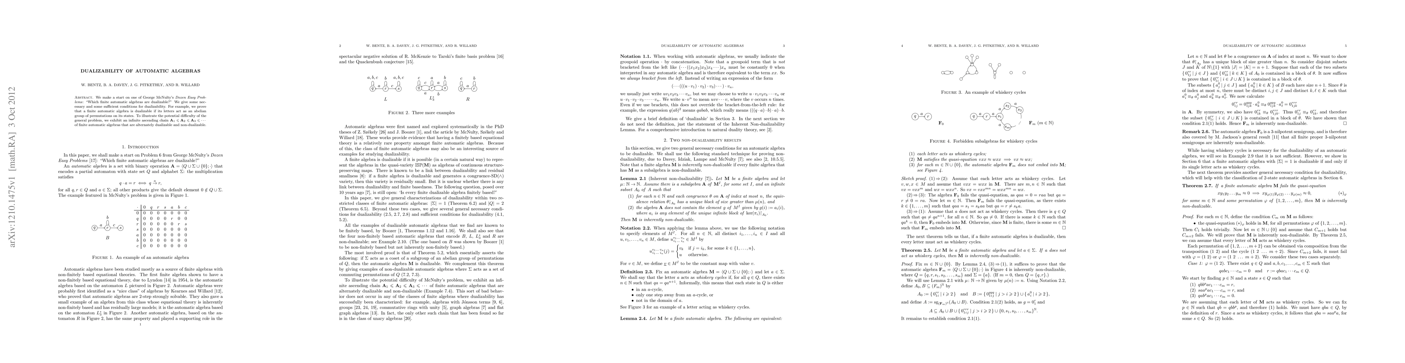 We make a start on one of George McNulty's Dozen Easy Problems: "Which finite automatic algebras are dualizable?" We give some necessary and some sufficient conditions for dualizability. For example, we prove that a finite automatic algebra is dualizable if its letters act as an abelian group of permutations on its states. To illustrate the potential difficulty of the general problem, we exhibit an infinite ascending chain $\mathbf A_1 \le \mathbf A_2 \le \mathbf A_3 \le ...b$ of finite automatic algebras that are alternately dualizable and non-dualizable.