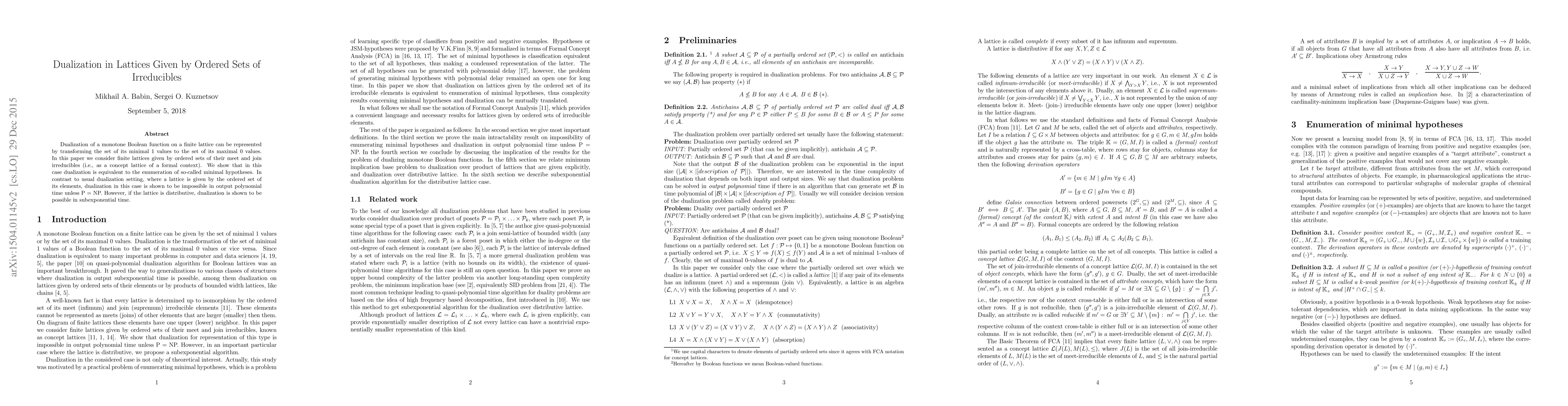 This paper explores dualization in finite lattices represented by ordered sets of irreducibles, demonstrating that dualization is equivalent to enumerating minimal hypotheses. It concludes that dualization is computationally hard in general, but becomes feasible in subexponential time for distributive lattices.