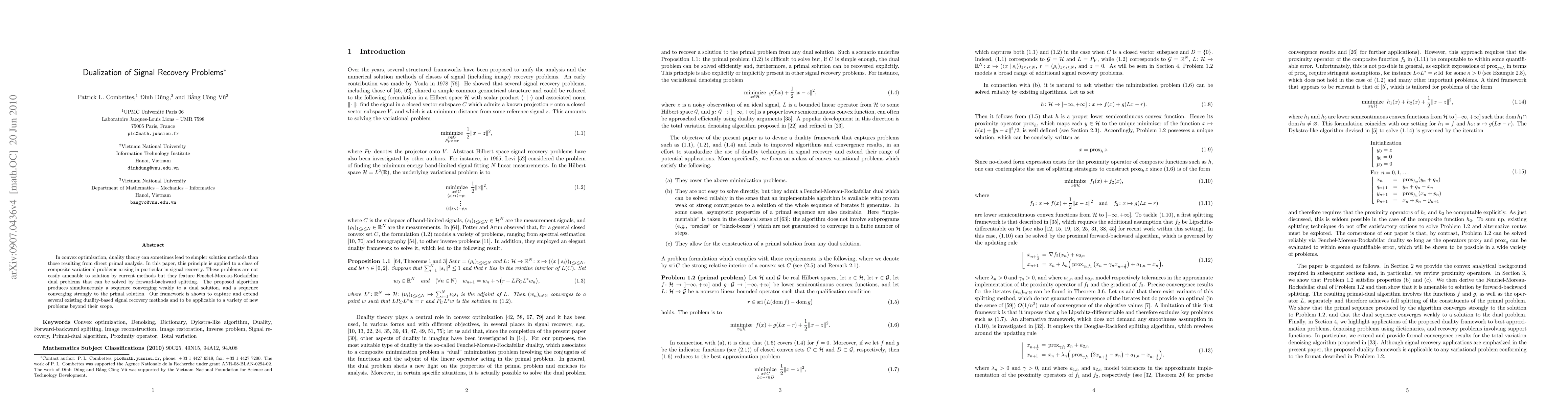 In convex optimization, duality theory can sometimes lead to simpler solution methods than those resulting from direct primal analysis. In this paper, this principle is applied to a class of composite variational problems arising in particular in signal recovery. These problems are not easily amenable to solution by current methods but they feature Fenchel-Moreau-Rockafellar dual problems that can be solved by forward-backward splitting. The proposed algorithm produces simultaneously a sequence converging weakly to a dual solution, and a sequence converging strongly to the primal solution. Our framework is shown to capture and extend several existing duality-based signal recovery methods and to be applicable to a variety of new problems beyond their scope.