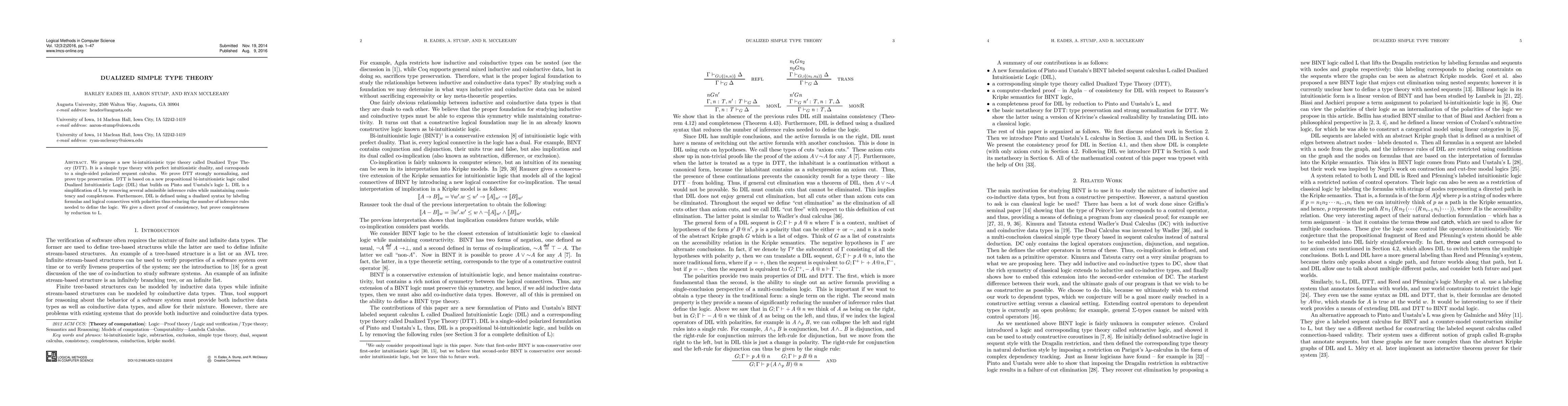 A new type theory called Dualized Type Theory (DTT) is proposed, which combines intuitionistic duality with a simple syntax, proving strong normalization and type preservation.