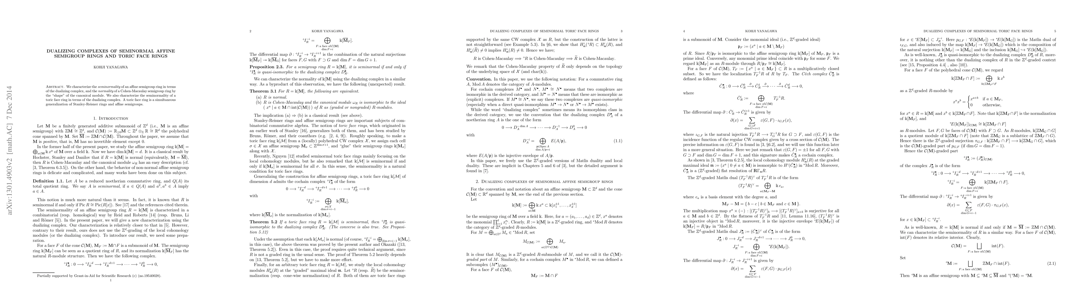 We characterize the seminormality of an affine semigroup ring in terms of the dualizing complex, and the normality of a Cohen-Macaulay semigroup ring by the "shape" of the canonical module. We also characterize the seminormality of a toric face ring in terms of the dualizing complex. A toric face ring is a simultaneous generalization of Stanley-Reisner rings and affine semigroups.