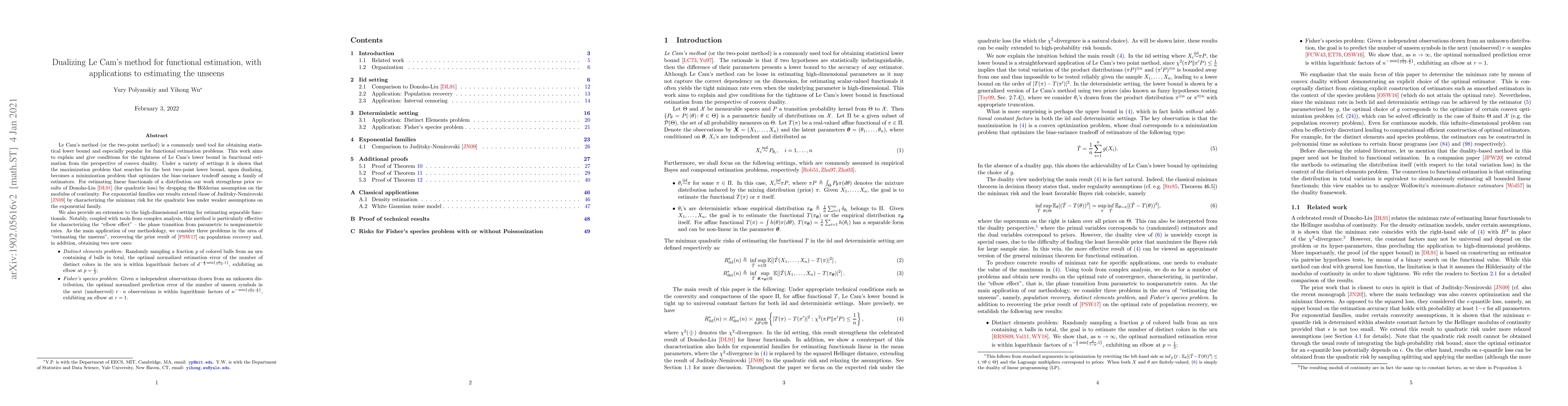 This paper extends Le Cam's method for functional estimation by leveraging convex duality to tighten statistical lower bounds and characterize the bias-variance tradeoff. It provides sharper minimax rates for estimating linear functionals and unseen symbols in high-dimensional settings, notably addressing the "elbow effect" in the Distinct elements and Fisher's species problems.