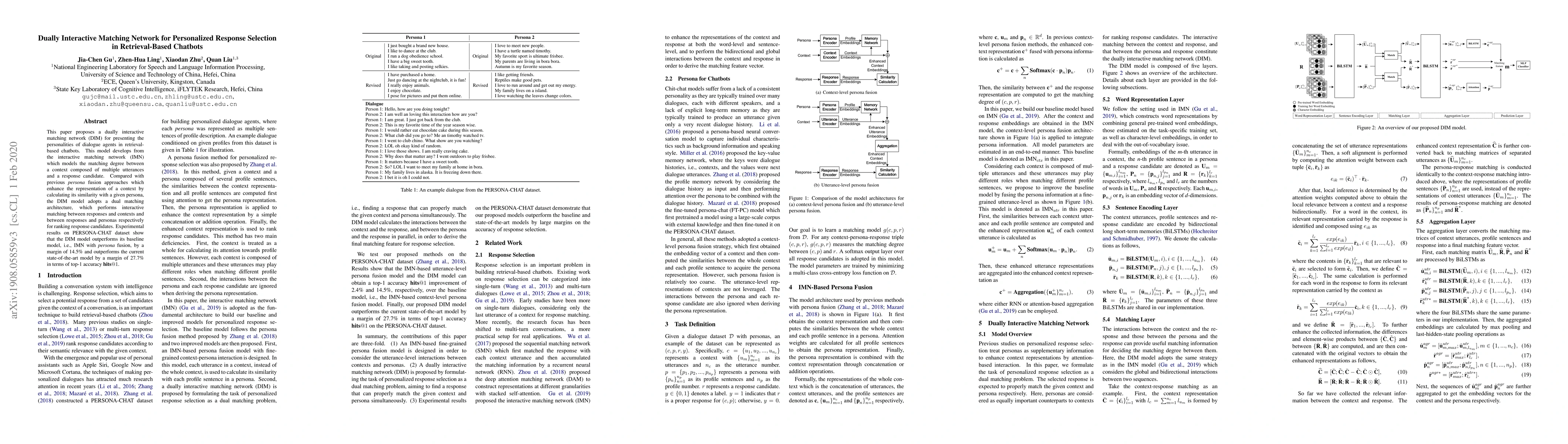 This paper introduces a dually interactive matching network (DIM) for enhancing personalized response selection in retrieval-based chatbots, outperforming previous models by utilizing a dual matching architecture that interactively matches responses with both contexts and personas. Experimental results demonstrate a significant improvement over baseline and state-of-the-art models in accuracy.