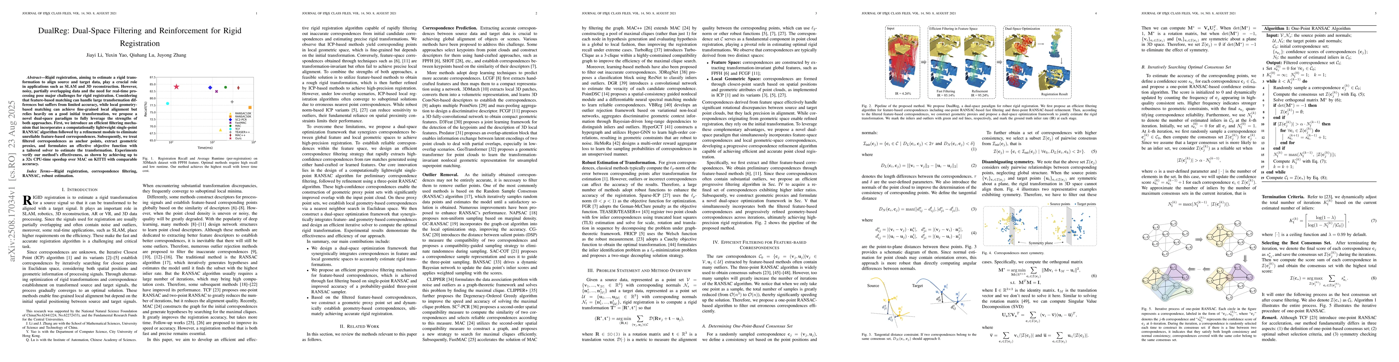 Rigid registration, aiming to estimate a rigid transformation to align source and target data, play a crucial role in applications such as SLAM and 3D reconstruction. However, noisy, partially overlapping data and the need for real-time processing pose major challenges for rigid registration. Considering that feature-based matching can handle large transformation differences but suffers from limited accuracy, while local geometry-based matching can achieve fine-grained local alignment but relies heavily on a good initial transformation, we propose a novel dual-space paradigm to fully leverage the strengths of both approaches. First, we introduce an efficient filtering mechanism that incorporates a computationally lightweight single-point RANSAC algorithm followed by a refinement module to eliminate unreliable feature-based correspondences. Subsequently, we treat filtered correspondences as anchor points, extract geometric proxies, and formulates an effective objective function with a tailored solver to estimate the transformation. Experiments verify our method's effectiveness, as shown by achieving up to a 32x CPU-time speedup over MAC on KITTI with comparable accuracy.
