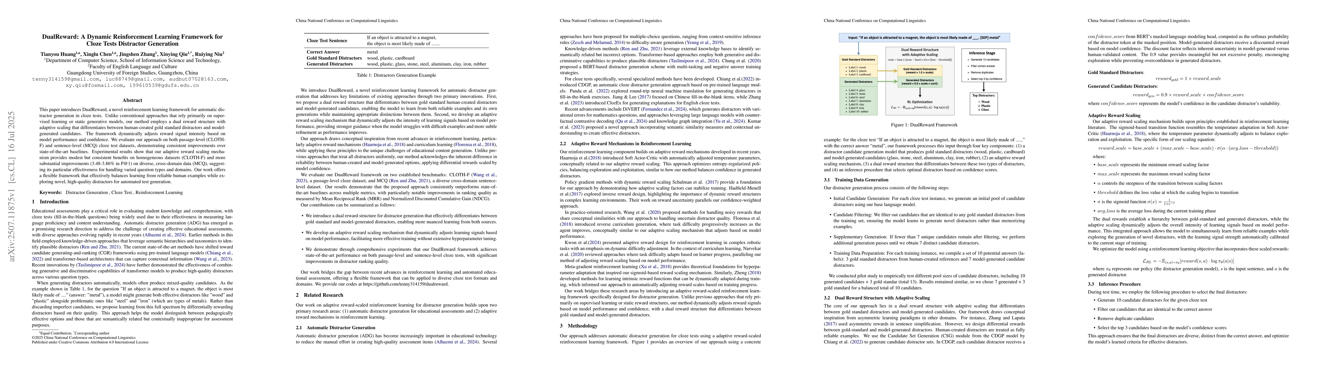 This paper introduces DualReward, a novel reinforcement learning framework for automatic distractor generation in cloze tests. Unlike conventional approaches that rely primarily on supervised learning or static generative models, our method employs a dual reward structure with adaptive scaling that differentiates between human-created gold standard distractors and model-generated candidates. The framework dynamically adjusts reward signal intensity based on model performance and confidence. We evaluate our approach on both passage-level (CLOTH-F) and sentence-level (MCQ) cloze test datasets, demonstrating consistent improvements over state-of-the-art baselines. Experimental results show that our adaptive reward scaling mechanism provides modest but consistent benefits on homogeneous datasets (CLOTH-F) and more substantial improvements (3.48-3.86% in P@1) on diverse, cross-domain data (MCQ), suggesting its particular effectiveness for handling varied question types and domains. Our work offers a flexible framework that effectively balances learning from reliable human examples while exploring novel, high-quality distractors for automated test generation.