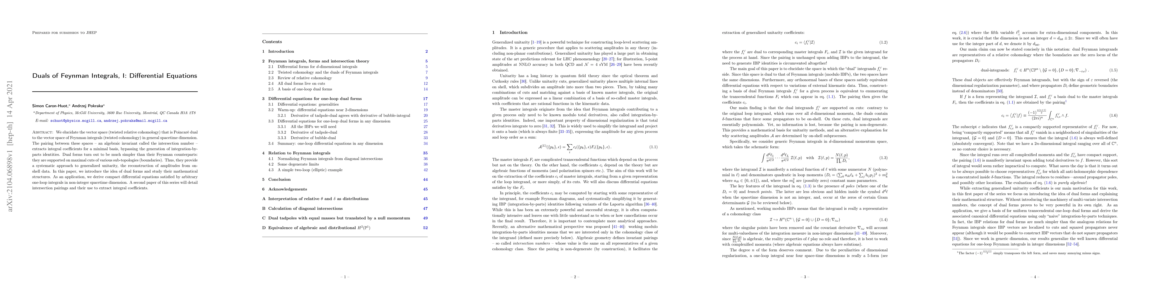 This paper introduces dual forms, which are simpler vector space counterparts to Feynman integrals, and explores their mathematical structures, leading to the derivation of compact differential equations for one-loop integrals in non-integer spacetime dimensions. The dual forms facilitate a systematic approach to generalized unitarity and the reconstruction of amplitudes from on-shell data.