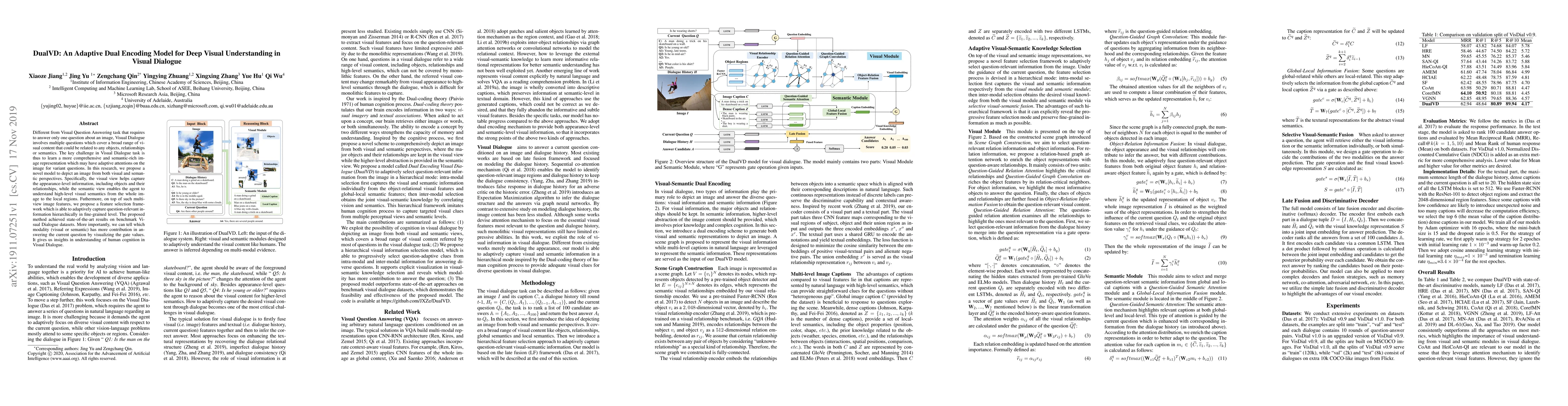 The paper introduces DualVD, an adaptive dual encoding model for deep visual understanding in visual dialogue, which captures both visual and semantic image representations to handle multiple questions. The model achieves state-of-the-art results and provides insights into modality contributions through gate value visualization.
