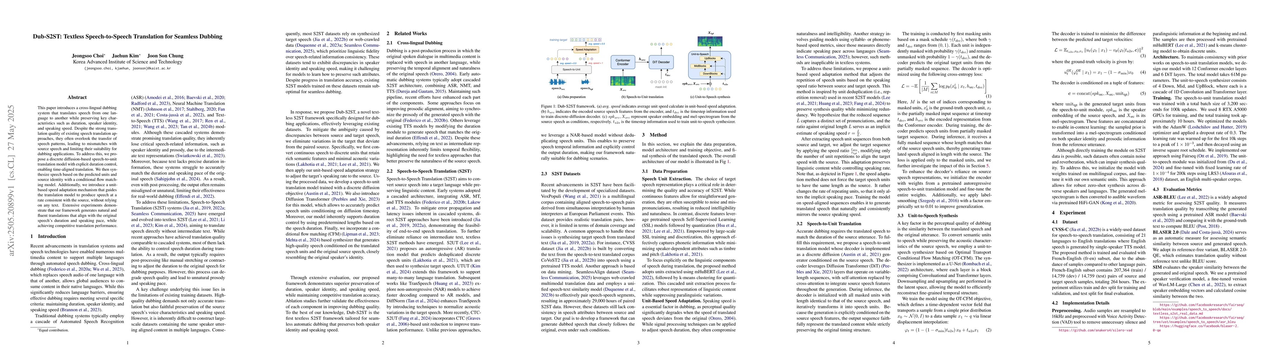 This work stands out by focusing on time-aligned translation and preserving speech characteristics without text, addressing a critical gap in current speech translation systems for dubbing applications.