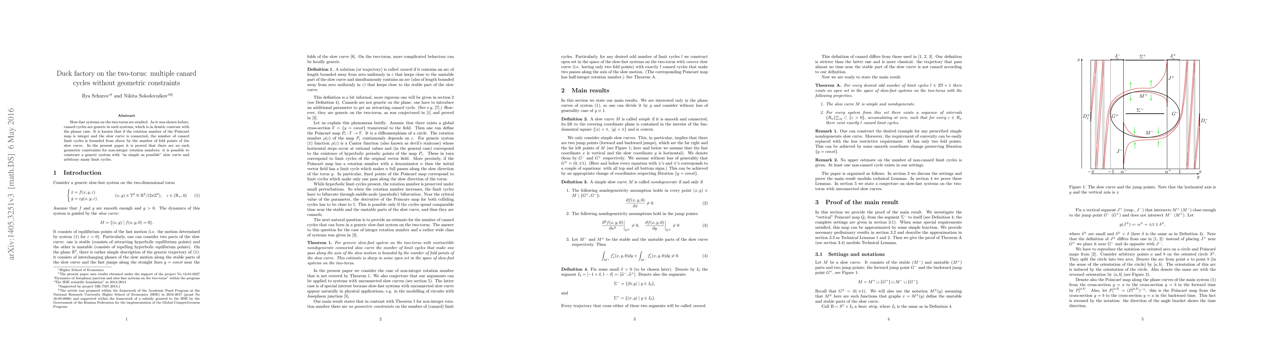 Slow-fast systems on the two-torus are studied. As it was shown before, canard cycles are generic in such systems, which is in drastic contrast with the planar case. It is known that if the rotation number of the Poincare map is integer and the slow curve is connected, the number of canard limit cycles is bounded from above by the number of fold points of the slow curve. In the present paper it is proved that there are no such geometric constraints for non-integer rotation numbers: it is possible to construct generic system with as simple as possible slow curve and arbitrary many limit cycles.