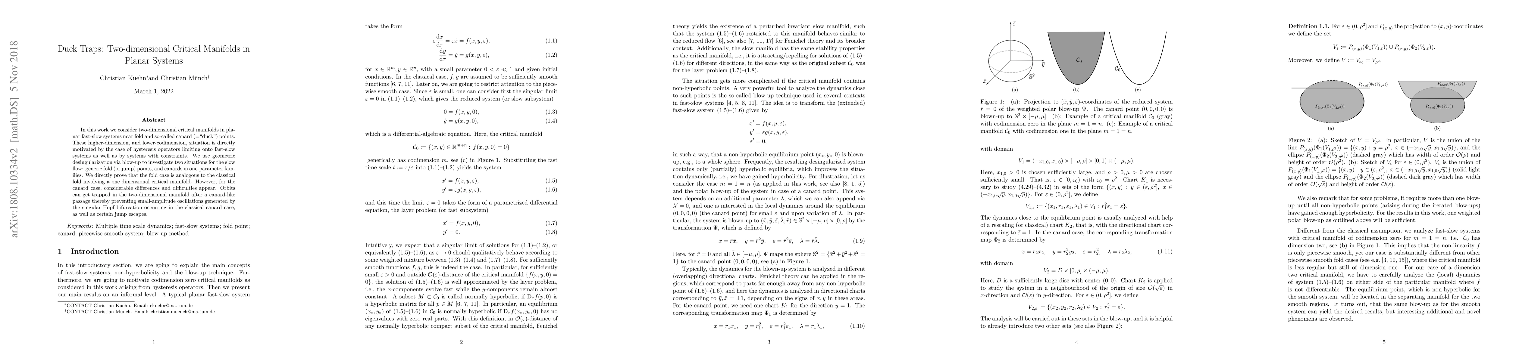 This paper investigates two-dimensional critical manifolds in planar fast-slow systems near fold and canard points, using geometric desingularization. It reveals that while fold points behave classically, canard points trap orbits in the manifold, preventing small oscillations and jump escapes.