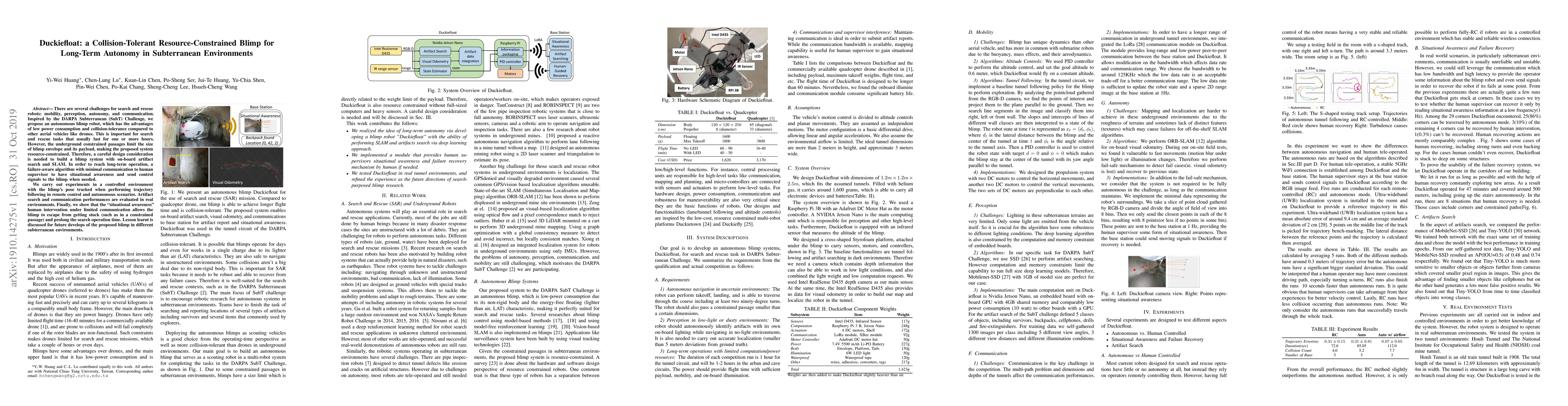 There are several challenges for search and rescue robots: mobility, perception, autonomy, and communication. Inspired by the DARPA Subterranean (SubT) Challenge, we propose an autonomous blimp robot, which has the advantages of low power consumption and collision-tolerance compared to other aerial vehicles like drones. This is important for search and rescue tasks that usually last for one or more hours. However, the underground constrained passages limit the size of blimp envelope and its payload, making the proposed system resource-constrained. Therefore, a careful design consideration is needed to build a blimp system with on-board artifact search and SLAM. In order to reach long-term operation, a failure-aware algorithm with minimal communication to human supervisor to have situational awareness and send control signals to the blimp when needed.