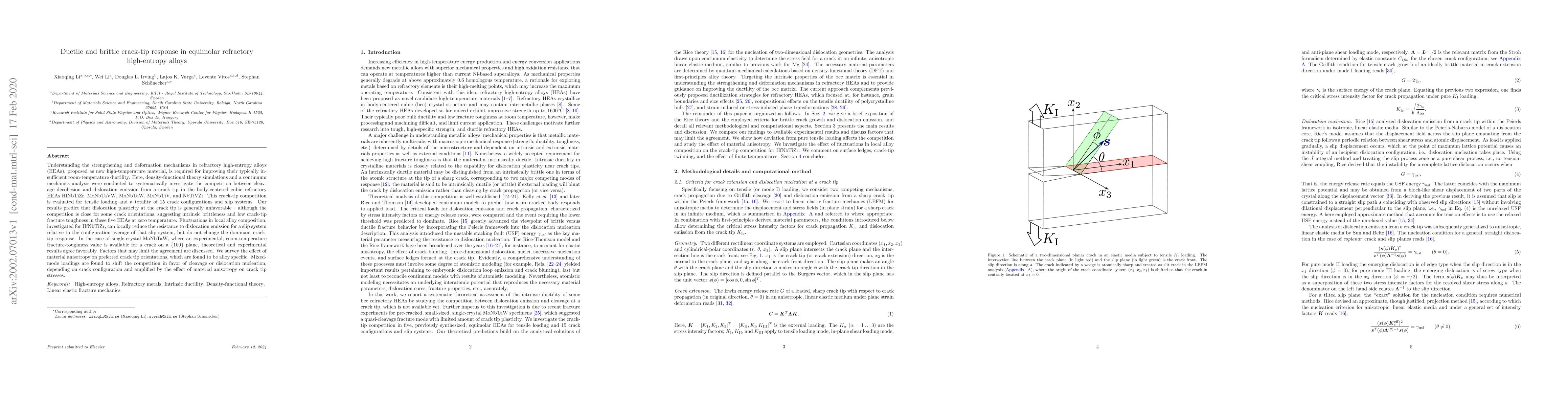 This study uses density-functional theory and continuum mechanics to analyze the crack-tip response in five equimolar refractory high-entropy alloys, finding that dislocation plasticity is generally unfavorable, indicating intrinsic brittleness. The research also highlights the influence of material anisotropy and mixed-mode loadings on crack behavior.