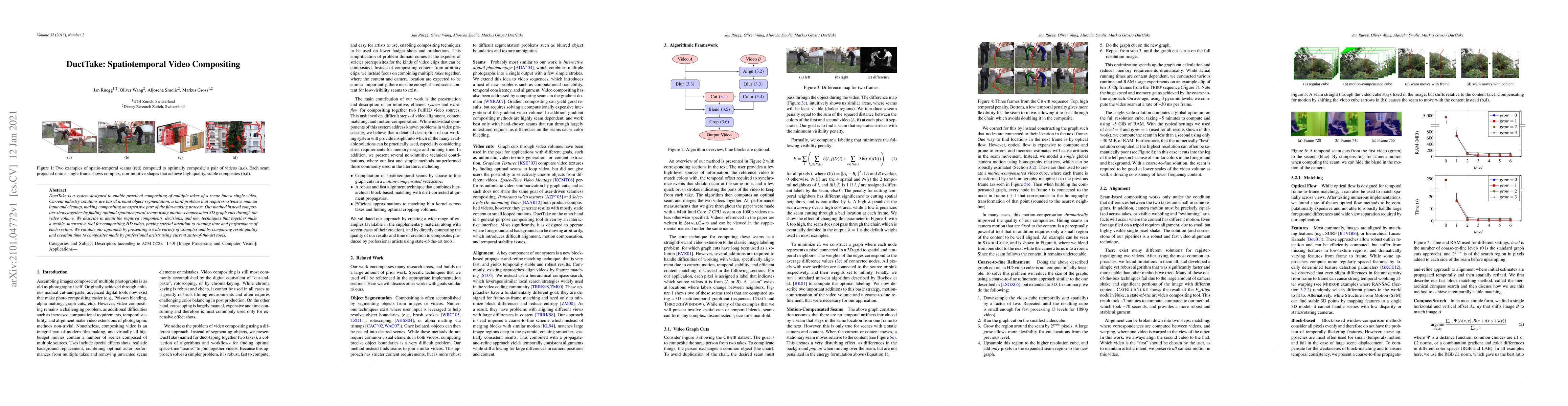 DuctTake is a system designed to enable practical compositing of multiple takes of a scene into a single video. Current industry solutions are based around object segmentation, a hard problem that requires extensive manual input and cleanup, making compositing an expensive part of the film-making process. Our method instead composites shots together by finding optimal spatiotemporal seams using motion-compensated 3D graph cuts through the video volume. We describe in detail the required components, decisions, and new techniques that together make a usable, interactive tool for compositing HD video, paying special attention to running time and performance of each section. We validate our approach by presenting a wide variety of examples and by comparing result quality and creation time to composites made by professional artists using current state-of-the-art tools.