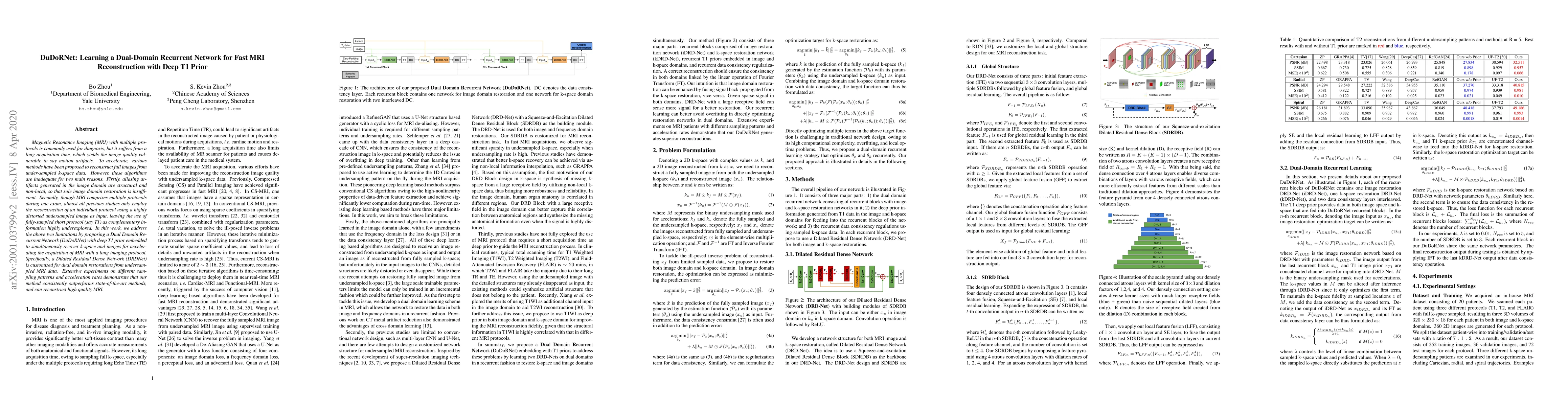 The paper proposes DuDoRNet, a Dual-Domain Recurrent Network with deep T1 prior, to accelerate MRI reconstruction from undersampled k-space data, addressing structural aliasing and underutilization of complementary information from fully-sampled short protocols. Experiments show it outperforms existing methods in reconstructing high-quality MRI images.